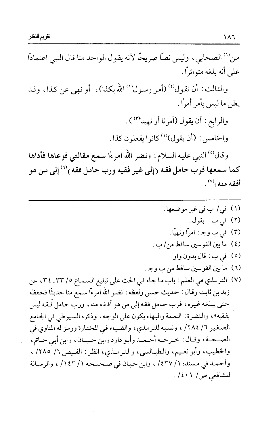 وَقَالَ النَّبِي عَلَيْهِ السَّلَام: " نضر الله امْرَءًا سمع مَقَالَتي فوعاها فأداها كَمَا سَمعهَا فَرب حَامِل فقه (إِلَى غير فَقِيه وَرب حَامِل فقه) إِلَى من هُوَ أفقه مِنْهُ ".