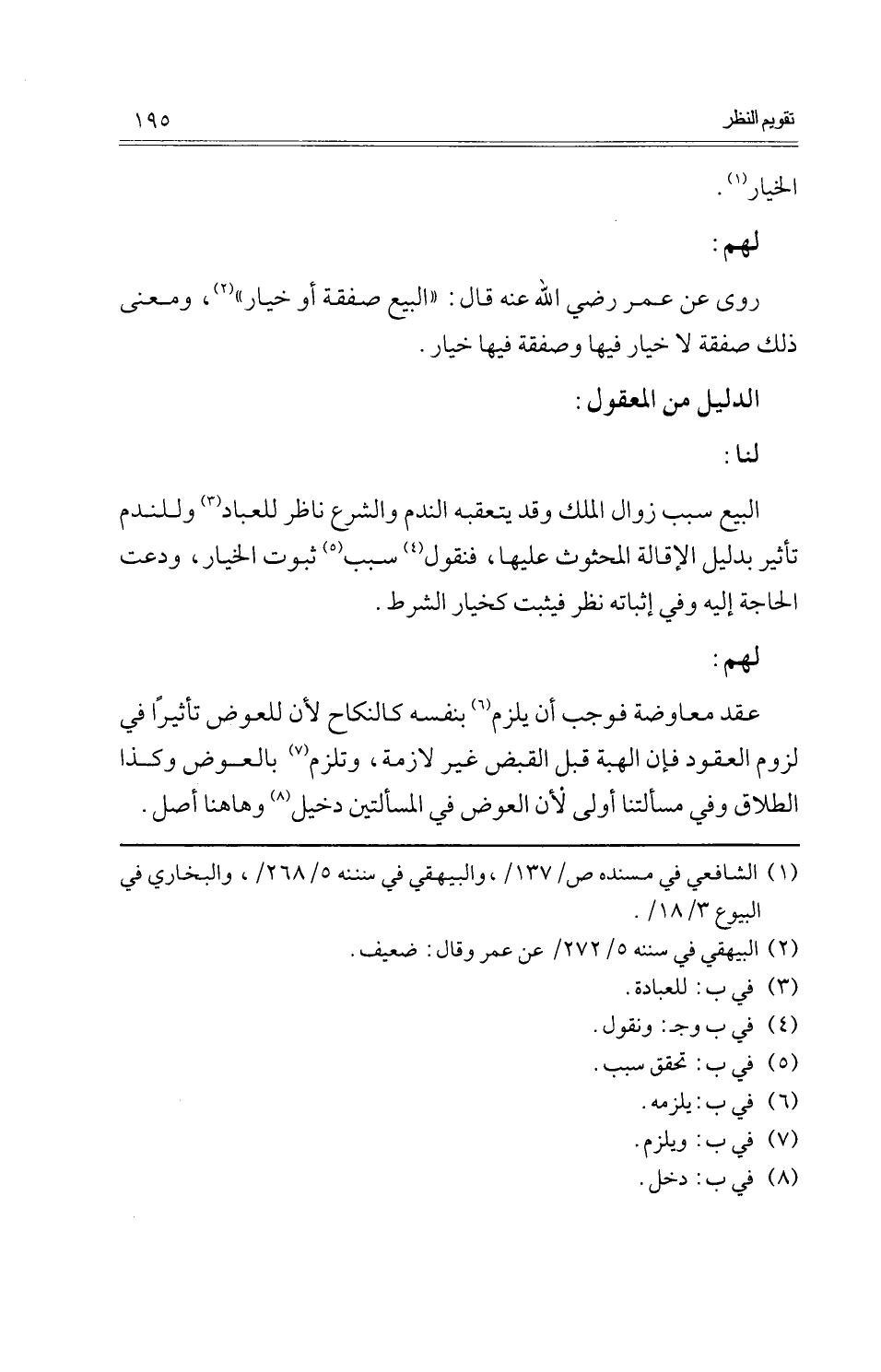 البيع سَبَب زَوَال الْملك وَقد يتعقبه النَّدَم وَالشَّرْع نَاظر للعباد وللندم تَأْثِير بِدَلِيل الْإِقَالَة المحثوث عَلَيْهَا، فَنَقُول سَبَب ثُبُوت الْخِيَار، ودعت الْحَاجة إِلَيْهِ وَفِي إثْبَاته نظر فَيثبت كَخِيَار الشَّرْط.