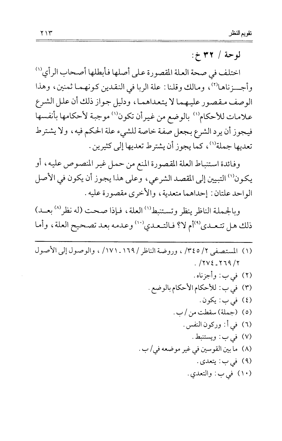 اخْتلف فِي صِحَة الْعلَّة الْمَقْصُورَة على أَصْلهَا فأبطلها أَصْحَاب الرَّأْي وأجزناها، وَمَالك وَقُلْنَا: عِلّة الرِّبَا فِي النَّقْدَيْنِ كَونهمَا ثمنين، وَهَذَا الْوَصْف مَقْصُور عَلَيْهِمَا لَا يتعداهما، وَدَلِيل جَوَاز ذَلِك أَن علل الشَّرْع عَلَامَات للْأَحْكَام بِالْوَضْعِ من غير أَن تكون مُوجبَة لأحكامها بأنفسها فَيجوز أَن يرد الشَّرْع بِجعْل صفة خَاصَّة للشَّيْء عِلّة الحكم فِيهِ، وَلَا يشْتَرط تعديها جملَة، كَمَا يجوز أَن يشْتَرط تعديها إِلَى كثيرين.