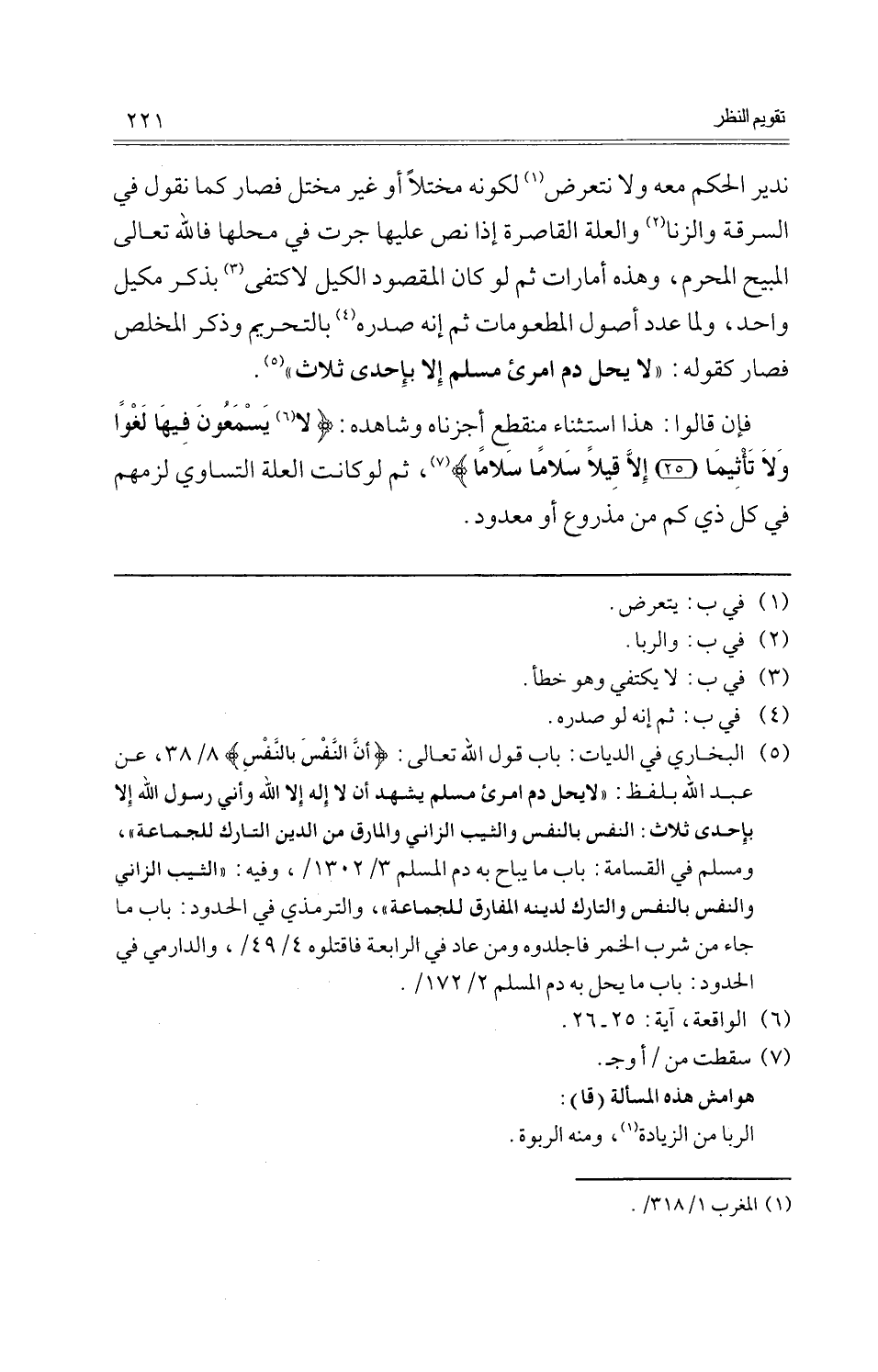 ندير الحكم مَعَه وَلَا نتعرض لكَونه مختلا أَو غير مختل فَصَارَ كَمَا نقُول فِي السّرقَة وَالزِّنَا وَالْعلَّة القاصرة إِذا نَص عَلَيْهَا جرت فِي محلهَا فَالله تَعَالَى الْمُبِيح الْمحرم، وَهَذِه أَمَارَات ثمَّ لَو كَانَ الْمَقْصُود الْكَيْل لاكتفى بِذكر مَكِيل وَاحِد، وَلما عدد أصُول المطعومات ثمَّ إِنَّه صَدره بِالتَّحْرِيمِ وَذكر المخلص فَصَارَ كَقَوْلِه: " لَا يحل دم امْرِئ مُسلم إِلَّا بِإِحْدَى ثَلَاث ".