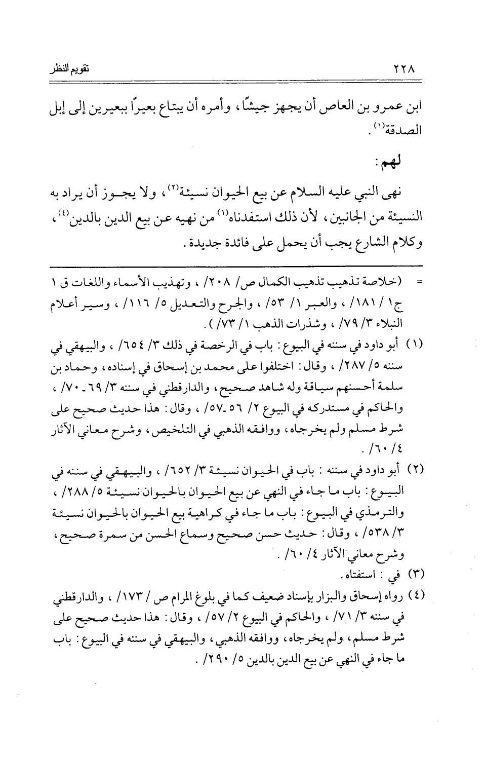 نهى النَّبِي عَلَيْهِ السَّلَام عَن بيع الْحَيَوَان نَسِيئَة، وَلَا يجوز أَن يُرَاد بِهِ النَّسِيئَة من الْجَانِبَيْنِ، لِأَن ذَلِك استفدناه من نَهْيه عَن بيع الدّين بِالدّينِ، وَكَلَام الشَّارِع يجب أَن يحمل على فَائِدَة جَدِيدَة.