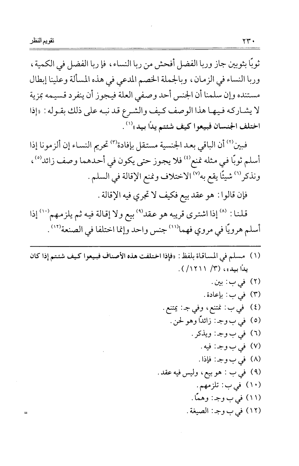 فَبين أَن الْبَاقِي بعد الجنسية مُسْتَقل بإفادة تَحْرِيم النِّسَاء إِن ألزمونا إِذا أسلم ثوبا فِي مثله نمْنَع فَلَا يجوز حَتَّى يكون فِي أَحدهمَا وصف زَائِد، وَنَذْكُر شَيْئا يَقع بِهِ الِاخْتِلَاف ونمنع الْإِقَالَة فِي السّلم.