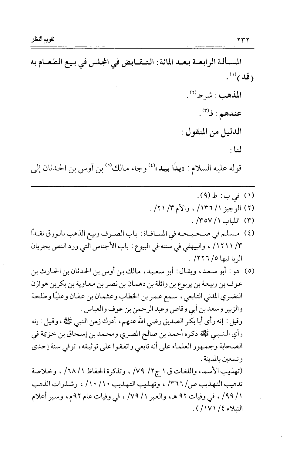 (الْمَسْأَلَة الرَّابِعَة بعد الْمِائَة: التَّقَابُض فِي الْمجْلس فِي بيع الطَّعَام بِهِ (قد)) .