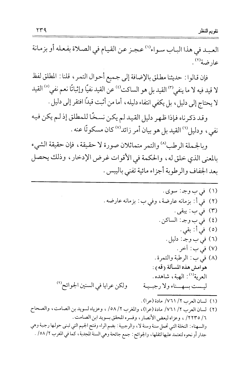 فَإِن قَالُوا: حديثنا مُطلق بِالْإِضَافَة إِلَى جَمِيع أَحْوَال التَّمْر، قُلْنَا: الْمُطلق لفظ لَا قيد فِيهِ لَا مَا يَنْفِي الْقَيْد بل هُوَ السَّاكِت عَن الْقَيْد نفيا وإثباتا نعم نفي الْقَيْد لَا يحْتَاج إِلَى دَلِيل، بل يَكْفِي انْتِفَاء دَلِيله، أما من أثبت قيدا افْتقر إِلَى دَلِيل.