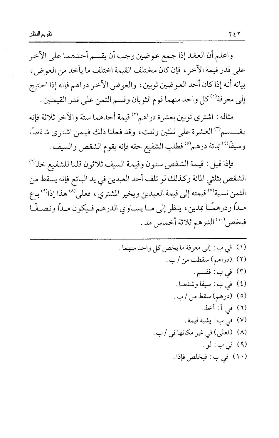 مِثَاله: اشْترى ثَوْبَيْنِ بِعشْرَة دَرَاهِم قيمَة أَحدهمَا سِتَّة وَالْآخر ثَلَاثَة فَإِنَّهُ يقسم الْعشْرَة على ثلثين وَثلث، وَقد فعلنَا ذَلِك فِيمَن اشْترى شِقْصا وسيفا بِمِائَة دِرْهَم فَطلب الشَّفِيع حَقه فَإِنَّهُ يقوم الشّقص وَالسيف.