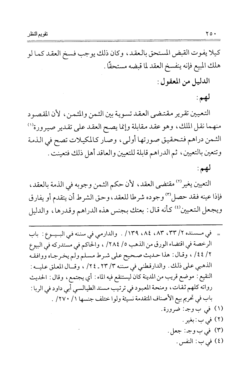 التَّعْيِين تَقْرِير مُقْتَضى العقد تَسْوِيَة بَين الثّمن والمثمن، لِأَن الْمَقْصُود مِنْهُمَا نقل الْملك، وَهُوَ عقد مُقَابلَة وَإِنَّمَا يَصح العقد على تَقْدِير صيرورة الثّمن دَرَاهِم فتحقيق صورتهَا أولى، وَصَارَ كالمكيلات تصح فِي الذِّمَّة وتتعين بِالتَّعْيِينِ، ثمَّ الدَّرَاهِم قَابِلَة للتعيين والعاقد أهل ذَلِك فتعينت.