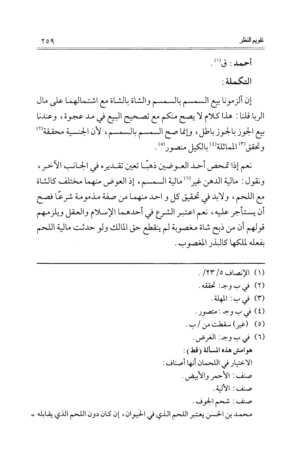 إِن ألزمونا بيع السمسم بالسمسم وَالشَّاة بِالشَّاة مَعَ اشتمالهما على مَال الرِّبَا قُلْنَا: هَذَا كَلَام لَا يَصح مِنْكُم مَعَ تَصْحِيح البيع فِي مد عَجْوَة، وَعِنْدنَا بيع الْجَوْز بالجوز بَاطِل، وَإِنَّمَا صَحَّ السمسم بالسمسم، لِأَن الجنسية مُحَققَة وَتحقّق الْمُمَاثلَة بِالْكَيْلِ مَنْصُور.