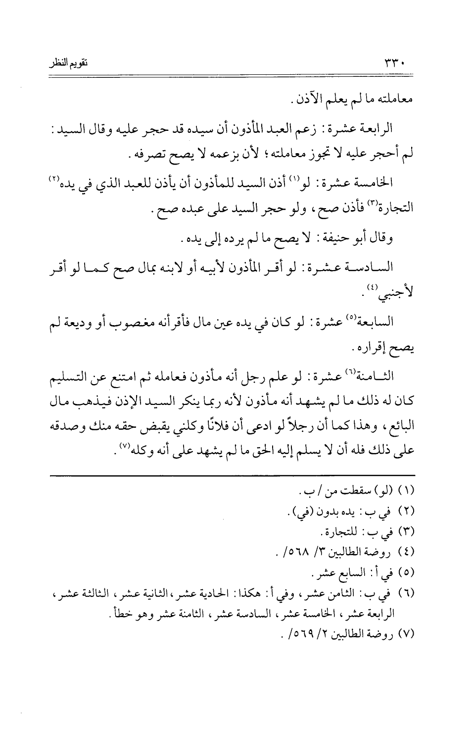 الثَّامِنَة عشرَة: لَو علم رجل أَنه مَأْذُون فعامله ثمَّ امْتنع عَن التَّسْلِيم كَانَ لَهُ ذَلِك مَا لم يشْهد أَنه مَأْذُون لِأَنَّهُ رُبمَا يُنكر السَّيِّد الْإِذْن فَيذْهب مَال البَائِع، وَهَذَا كَمَا أَن رجلا لَو ادّعى أَن فلَانا وكلني يقبض حَقه مِنْك وَصدقه على ذَلِك فَلهُ أَن لَا يسلم إِلَيْهِ الْحق مَا لم يشْهد على أَنه وَكله.