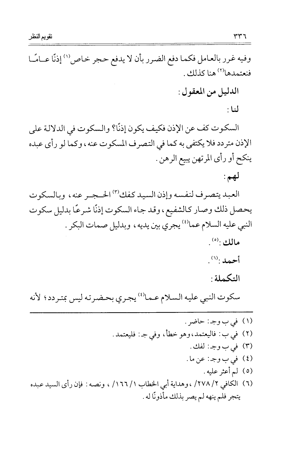 العَبْد يتَصَرَّف لنَفسِهِ وَإِذن السَّيِّد كفك الْحجر عَنهُ، وبالسكوت يحصل ذَلِك وَصَارَ كالشفيع، وَقد جَاءَ السُّكُوت إِذْنا شرعا بِدَلِيل سكُوت النَّبِي عَلَيْهِ السَّلَام عَمَّا يجْرِي بَين يَدَيْهِ، وبدليل صمَات الْبكر.