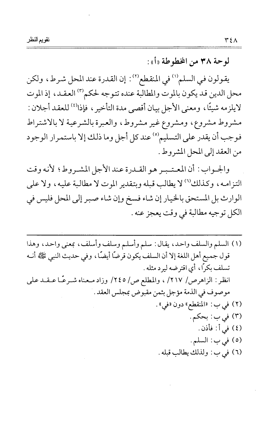 يَقُولُونَ فِي السّلم فِي الْمُنْقَطع: إِن الْقُدْرَة عِنْد الْمحل شَرط، وَلَكِن مَحل الدّين قد يكون بِالْمَوْتِ والمطالبة عِنْده تتَوَجَّه لحكم العقد، إِذْ الْمَوْت لَا يلْزمه شَيْئا، وَمعنى الْأَجَل بَيَان أقْصَى مُدَّة التَّأْخِير، فَإِذا للْعقد أجلان: مَشْرُوط مَشْرُوع، ومشروع غير مَشْرُوط، وَالْعبْرَة بالشرعية لَا بالاشتراط فَوَجَبَ أَن يقدر على التَّسْلِيم عِنْد كل أجل وَمَا ذَلِك إِلَّا باستمرار الْوُجُود من العقد إِلَى الْمحل الْمَشْرُوط.