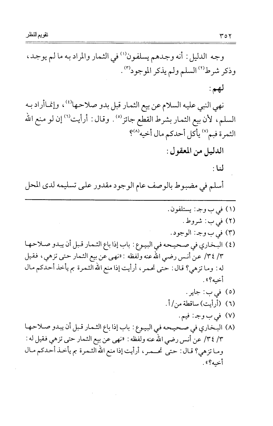 نهى النَّبِي عَلَيْهِ السَّلَام عَن بيع الثِّمَار قبل بَدو صَلَاحهَا، وَإِنَّمَا أَرَادَ بِهِ السّلم، لِأَن بيع الثِّمَار بِشَرْط الْقطع جَائِز. وَقَالَ: أَرَأَيْت إِن لَو منع الله الثَّمَرَة فَبِمَ يَأْكُل أحدكُم مَال أَخِيه؟