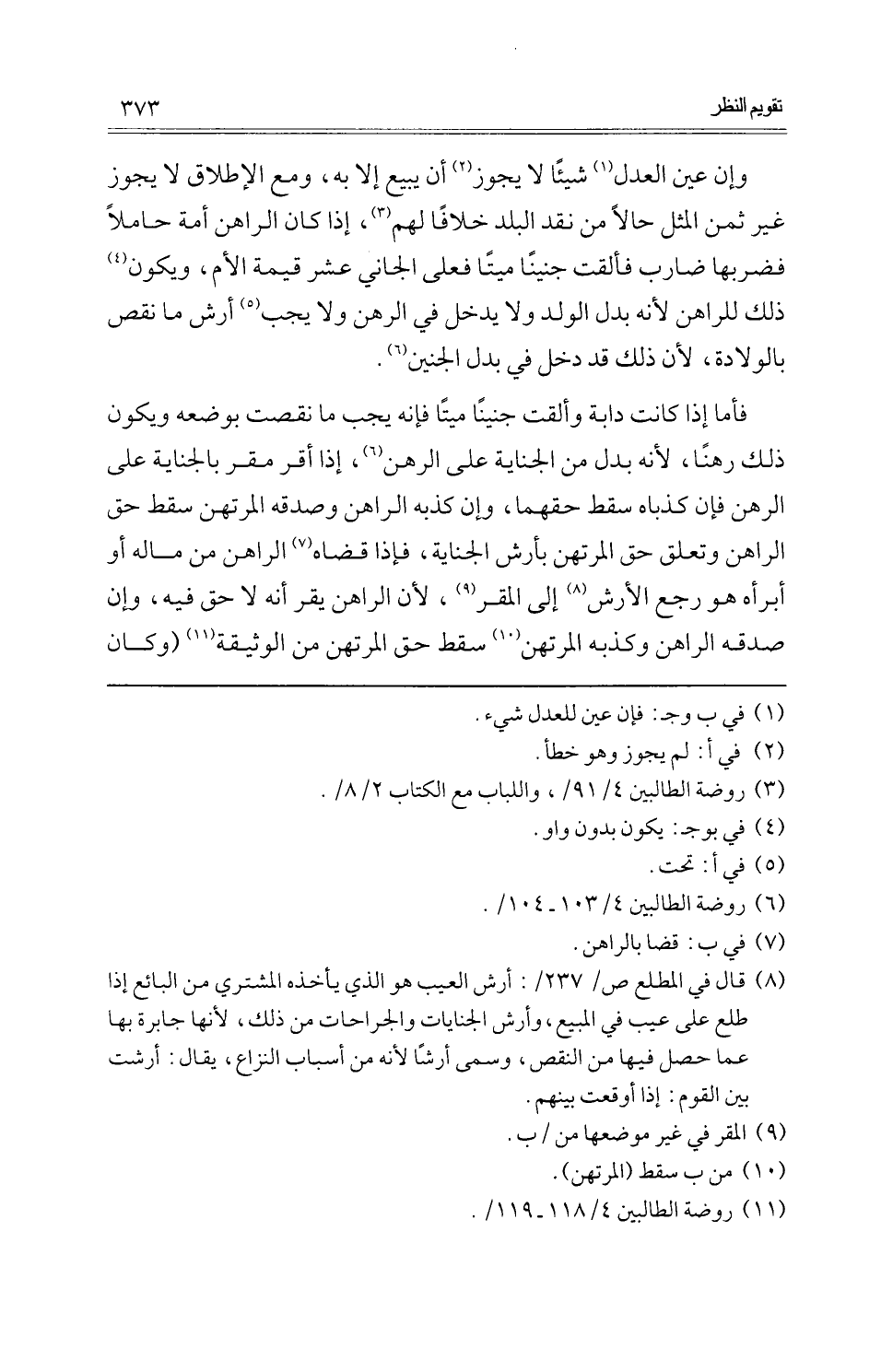 فَأَما إِذا كَانَت دَابَّة وَأَلْقَتْ جَنِينا مَيتا فَإِنَّهُ يجب مَا نقصت بِوَضْعِهِ وَيكون ذَلِك رهنا، لِأَنَّهُ بدل من الْجِنَايَة على الرَّهْن، إِذا أقرّ مقرّ بِالْجِنَايَةِ على الرَّهْن فَإِن كذباه سقط حَقّهمَا، وَإِن كذبه الرَّاهِن وَصدقه الْمُرْتَهن سقط حق الرَّاهِن وَتعلق حق الْمُرْتَهن بِأَرْش الْجِنَايَة، فَإِن قَضَاهُ الرَّاهِن من مَاله أَو أَبرَأَهُ هُوَ رَجَعَ الْأَرْش إِلَى الْمقر، لِأَن الرَّاهِن يقر أَنه لَا حق فِيهِ، وَإِن صدقه الرَّاهِن وَكذبه الْمُرْتَهن سقط حق الْمُرْتَهن من الْوَثِيقَة (وَكَانَ