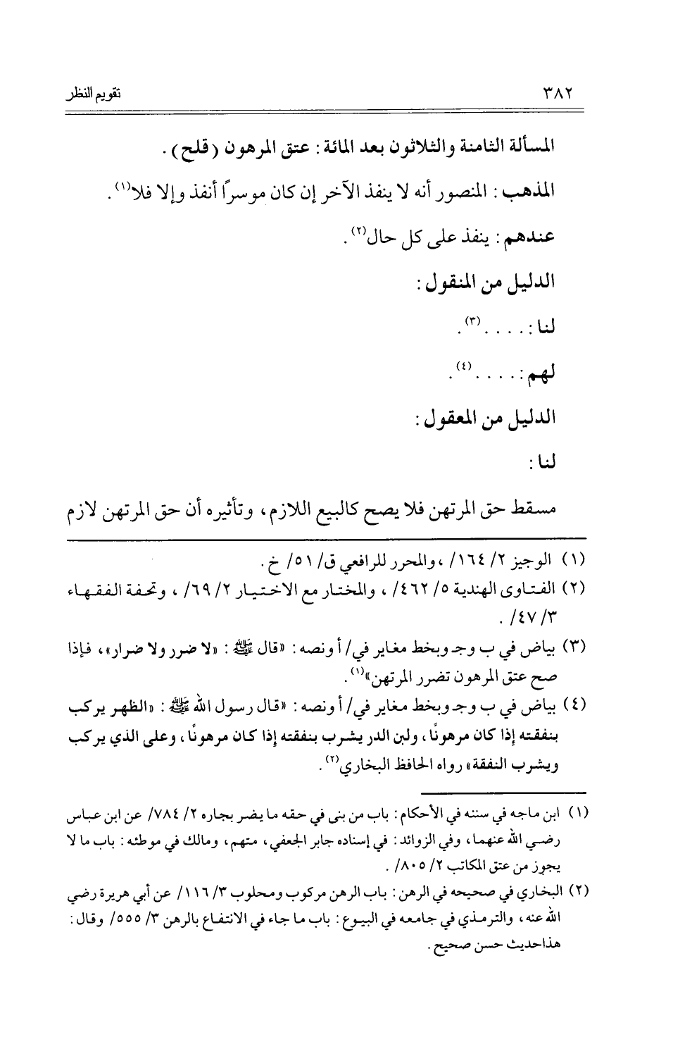 (الْمَسْأَلَة الثَّامِنَة وَالثَّلَاثُونَ بعد الْمِائَة: عتق الْمَرْهُون (قلح)) .