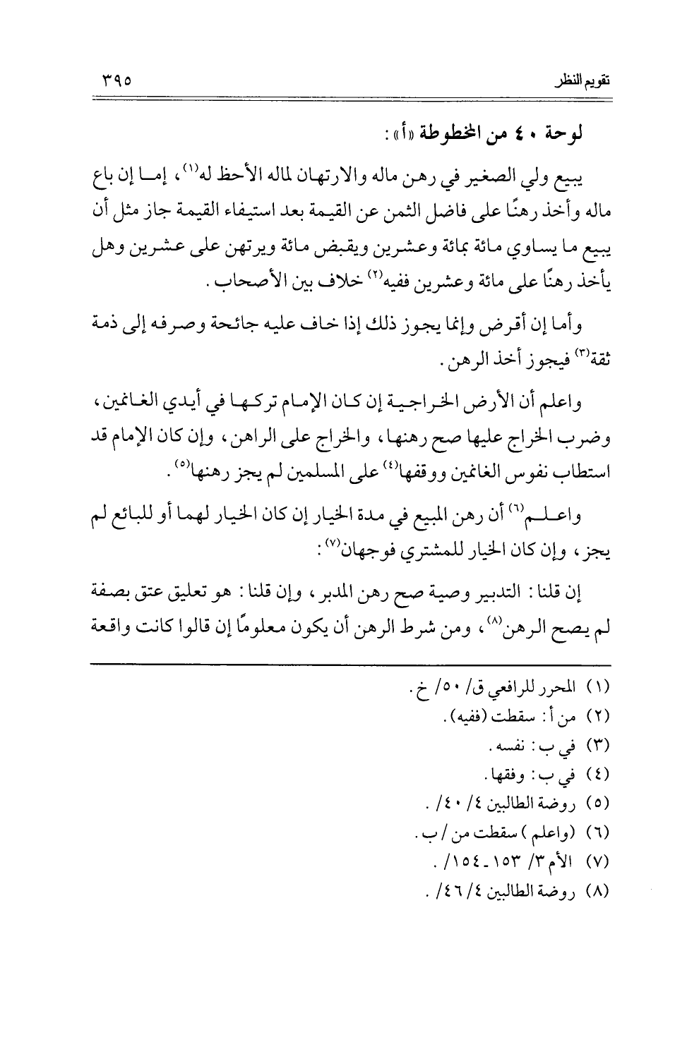 يَبِيع ولي الصَّغِير فِي رهن مَاله والارتهان لمَاله الأحظ لَهُ، إِمَّا إِن بَاعَ مَاله وَأخذ رهنا على فَاضل الثّمن عَن الْقيمَة بعد اسْتِيفَاء الْقيمَة جَازَ مثل أَن يَبِيع مَا يُسَاوِي مائَة بِمِائَة وَعشْرين وَيقبض مائَة ويرتهن على عشْرين وَهل يَأْخُذ رهنا على مائَة وَعشْرين فَفِيهِ خلاف بَين الْأَصْحَاب.