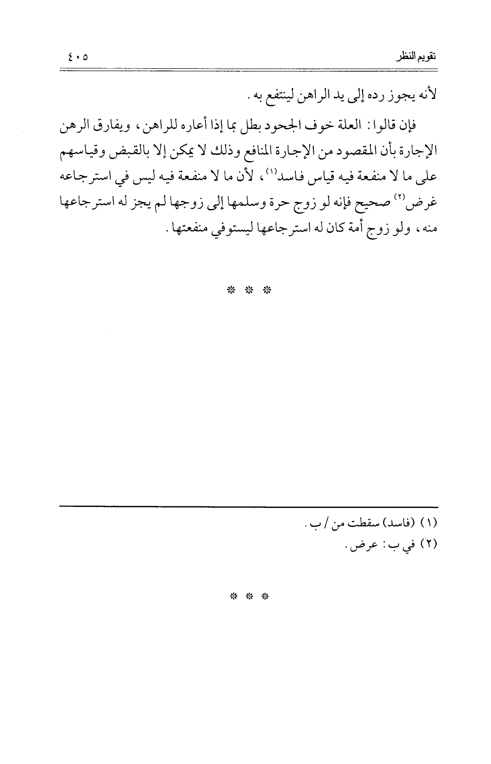 فَإِن قَالُوا: الْعلَّة خوف الْجُحُود بَطل بِمَا إِذا أَعَارَهُ للرَّاهِن، وَيُفَارق الرَّهْن الْإِجَارَة بِأَن الْمَقْصُود من الْإِجَارَة الْمَنَافِع وَذَلِكَ لَا يُمكن إِلَّا بِالْقَبْضِ وقياسهم على مَا لَا مَنْفَعَة فِي قِيَاس فَاسد، لِأَن مَا لَا مَنْفَعَة فِيهِ لَيْسَ فِيهِ استرجاعه غَرَض صَحِيح فَإِنَّهُ لَو زوج حرَّة وَسلمهَا إِلَى زَوجهَا لم يجز لَهُ استرجاعها مِنْهُ، وَلَو زوج أمة كَانَ لَهُ استرجاعها ليستوفي مَنْفَعَتهَا.