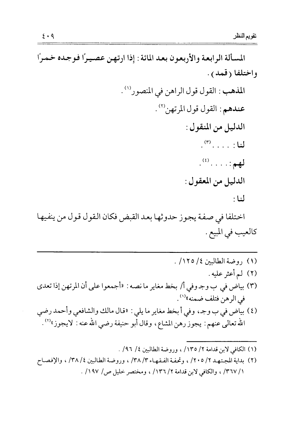 (الْمَسْأَلَة الرَّابِعَة وَالْأَرْبَعُونَ بعد الْمِائَة: إِذا ارْتهن عصيرا فَوَجَدَهُ خمرًا وَاخْتلفَا (قمد)) .