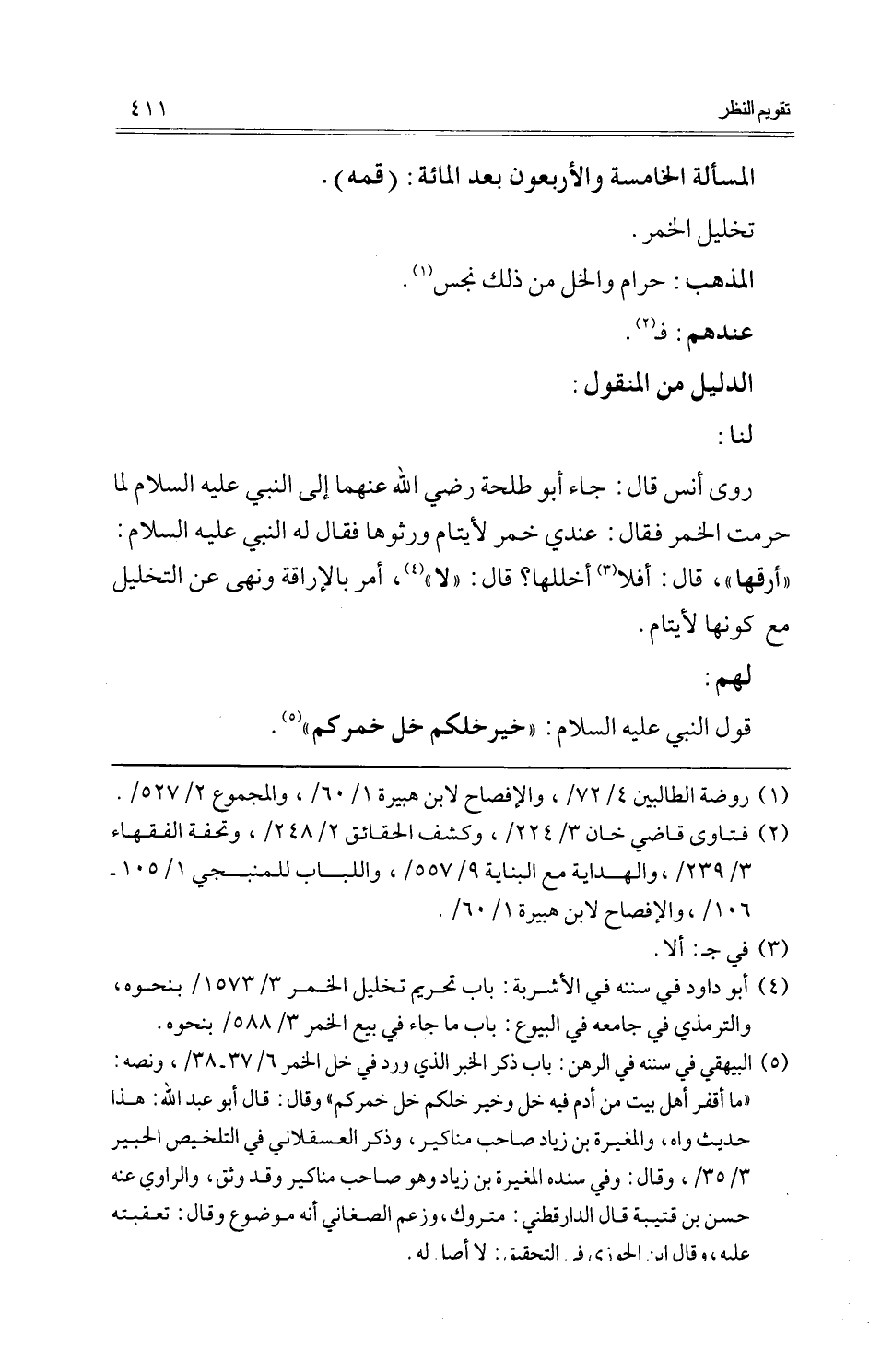 روى أنس قَالَ: جَاءَ أَبُو طَلْحَة رَضِي الله عَنْهُمَا إِلَى النَّبِي عَلَيْهِ السَّلَام لما حرمت الْخمر فَقَالَ: عِنْدِي خمر لأيتام ورثوها فَقَالَ لَهُ النَّبِي عَلَيْهِ السَّلَام: " أرقها "، قَالَ: أَفلا أخللها؟ قَالَ: " لَا "، أَمر بالإراقة وَنهى عَن التَّخْلِيل مَعَ كَونهَا لأيتام.