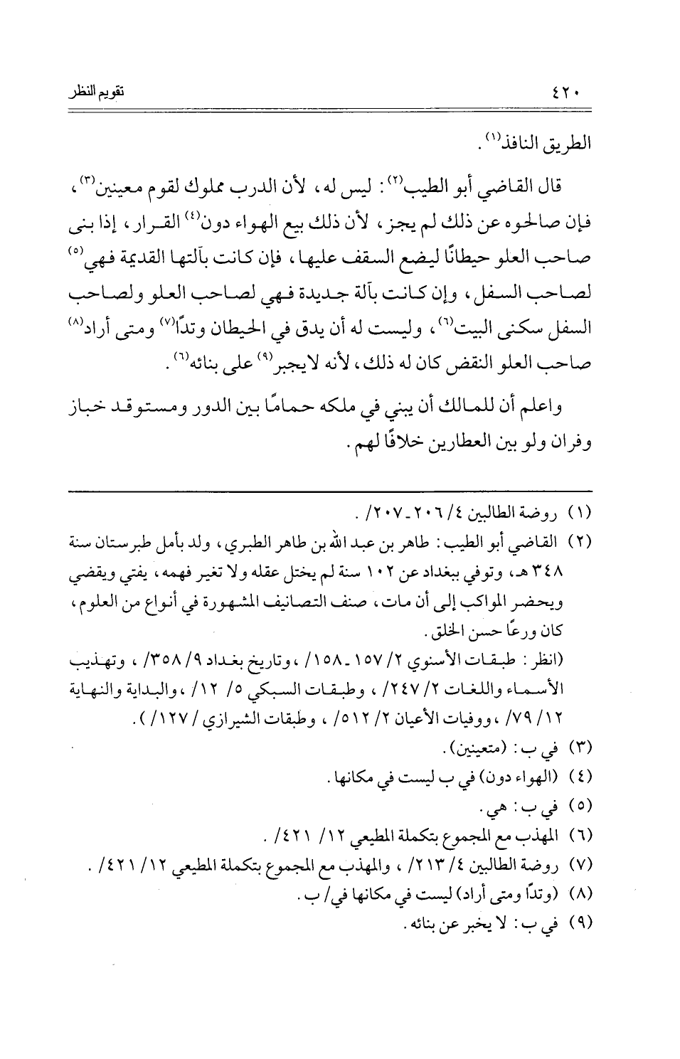 قَالَ القَاضِي أَبُو الطّيب: لَيْسَ لَهُ، لِأَن الدَّرْب مَمْلُوك لقوم مُعينين، فَإِن صالحوه عَن ذَلِك لم يجز، لِأَن ذَلِك بيع الْهَوَاء دون الْقَرار، إِذا بنى صَاحب الْعُلُوّ حيطانا ليضع السّقف عَلَيْهَا، فَإِن كَانَت بآلتها الْقَدِيمَة فَهِيَ لصَاحب السّفل، وَإِن كَانَت بِآلَة جَدِيدَة فَهِيَ لصَاحب الْعُلُوّ وَلِصَاحِب السّفل سُكْنى الْبَيْت، وَلَيْسَت لَهُ أَن يدق فِي الْحِيطَان وتدا وَمَتى أَرَادَ صَاحب الْعُلُوّ النَّقْض كَانَ لَهُ ذَلِك، لِأَنَّهُ لَا يجْبر على بنائِهِ.
