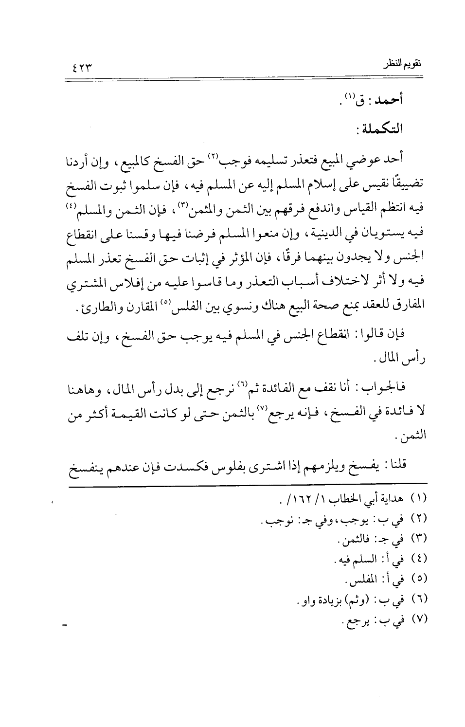 أحد عوضي الْمَبِيع فَتعذر تَسْلِيمه فَوَجَبَ حق الْفَسْخ كَالْمَبِيعِ، وَإِن أردنَا تضييقا نقيس على إِسْلَام الْمُسلم إِلَيْهِ عَن الْمُسلم فِيهِ، فَإِن سلمُوا ثُبُوت الْفَسْخ فِيهِ انتظم الْقيَاس واندفع فرقهم بَين الثّمن والمثمن، فَإِن الثّمن وَالْمُسلم فِيهِ يستويان فِي الدِّينِيَّة، وَإِن منعُوا الْمُسلم فَرضنَا فِيهَا وقسنا على انْقِطَاع الْجِنْس وَلَا يَجدونَ بَينهمَا فرقا، فَإِن الْمُؤثر فِي إِثْبَات حق الْفَسْخ تعذر الْمُسلم فِيهِ وَلَا اثر لاخْتِلَاف أَسبَاب التَّعَذُّر وَمَا قاسوا عَلَيْهِ من إفلاس المُشْتَرِي المفارق للْعقد بِمَنْع صِحَة البيع هُنَاكَ ونسوي بَين الْفلس الْمُقَارن والطارئ.