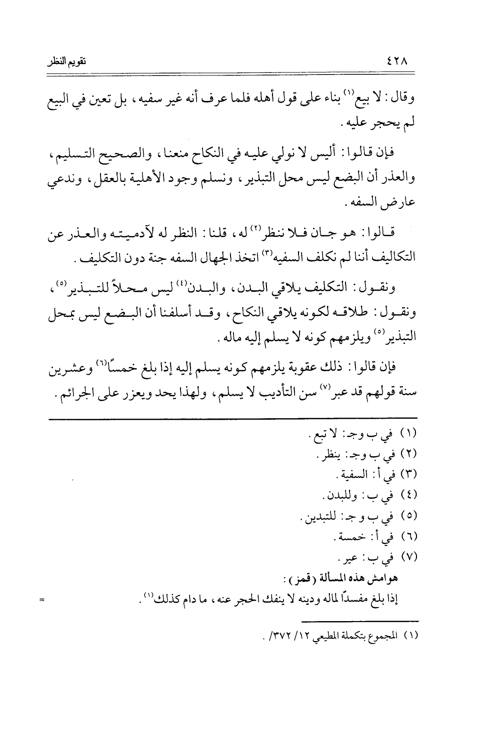 قَالُوا: هُوَ جَان فَلَا نَنْظُر لَهُ، قُلْنَا: النّظر لَهُ لآدميته والعذر عَن التكاليف أننا لم نكلف السَّفِيه اتخذ الْجُهَّال السَّفه جنَّة دون التَّكْلِيف.