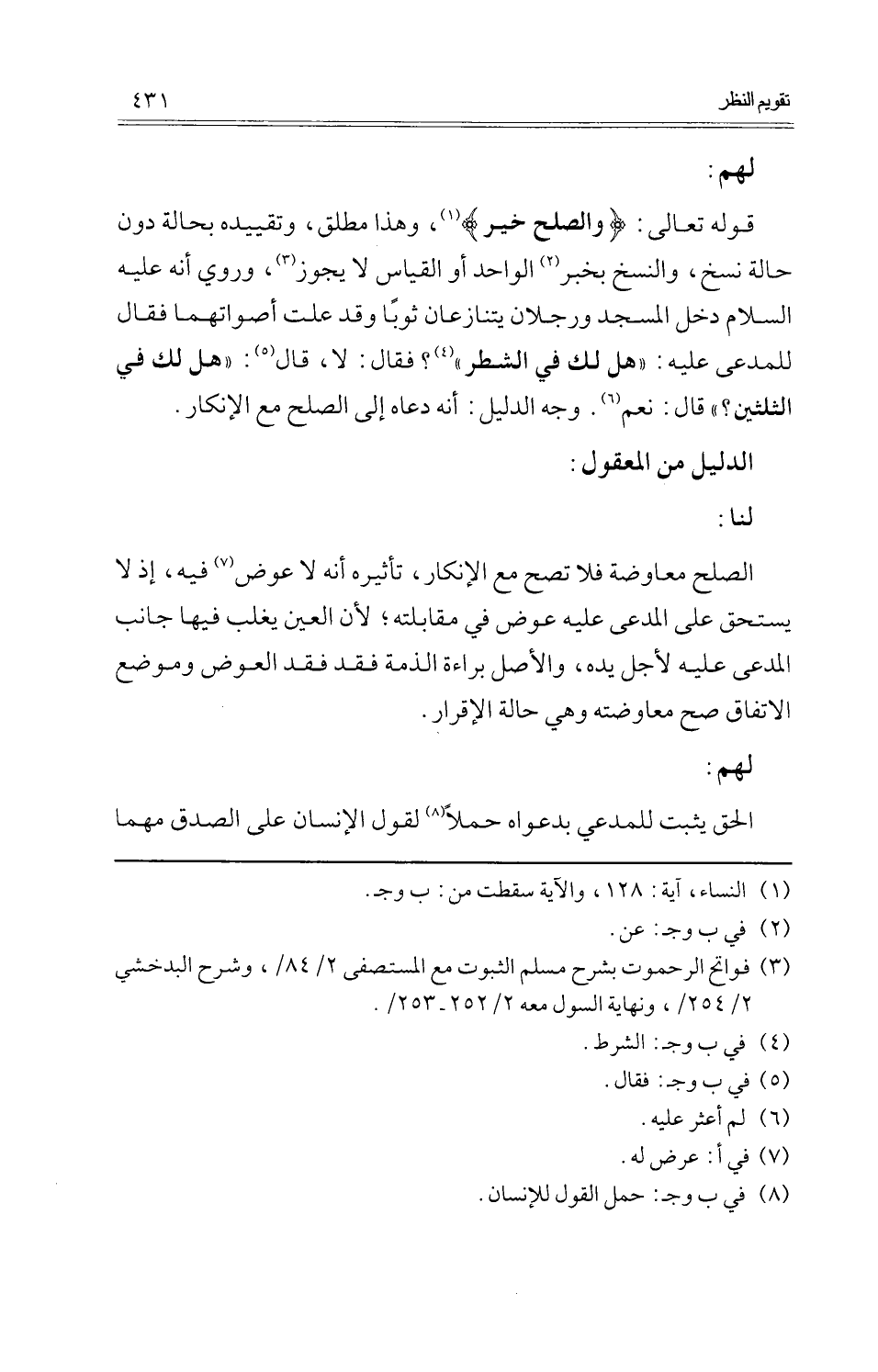 قَوْله تَعَالَى: {وَالصُّلْح خير} ، وَهَذَا مُطلق، وتقييده بِحَالَة دون حَالَة نسخ، والنسخ بِخَبَر الْوَاحِد أَو الْقيَاس لَا يجوز، وَرُوِيَ أَنه عَلَيْهِ السَّلَام دخل الْمَسْجِد ورجلان يتنازعان ثوبا وَقد علت أصواتهما فَقَالَ للْمُدَّعى عَلَيْهِ: " هَل لَك فِي الشّطْر "؟ فَقَالَ: لَا، قَالَ: " هَل لَك فِي الثُّلثَيْنِ؟ " قَالَ: نعم. وَجه الدَّلِيل: أَنه دَعَاهُ إِلَى الصُّلْح مَعَ الْإِنْكَار.