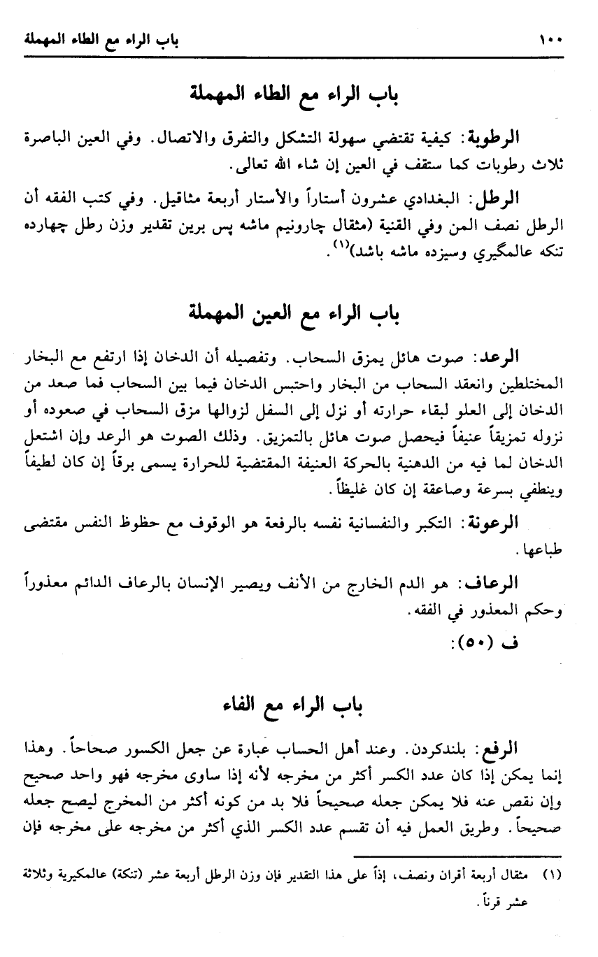الرطل: الْبَغْدَادِيّ عشرُون أستارا والأستار أَرْبَعَة مَثَاقِيل. وَفِي كتب الْفِقْه أَن الرطل نصف الْمَنّ وَفِي الْقنية (مِثْقَال جارونيم ماشه بس برين تَقْدِير وزن رَطْل جهارده تنكه عالمكيري وسيزده ماشه باشد) .