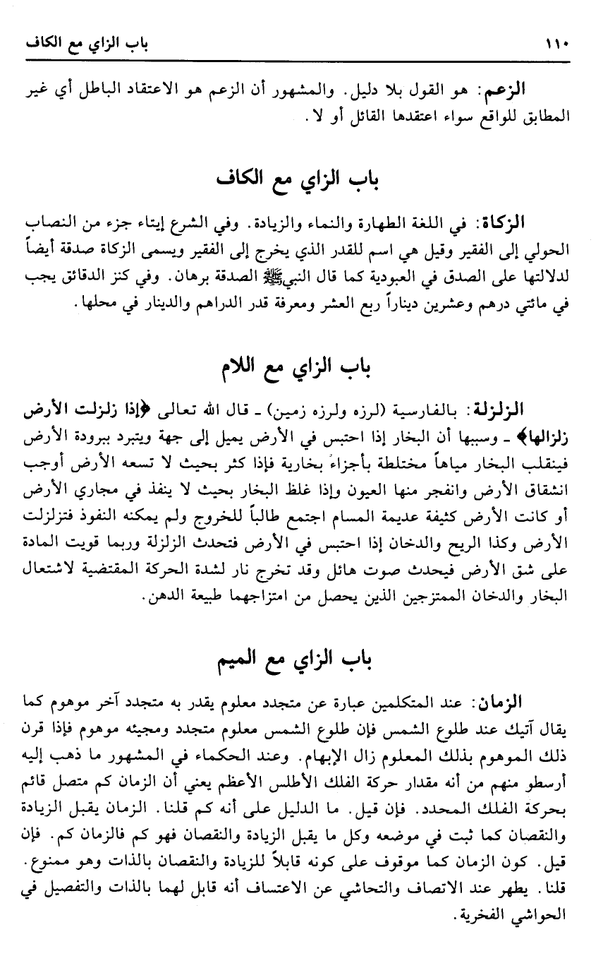الزلزلة: بِالْفَارِسِيَّةِ (لرزه ولرزه زمين) - قَالَ الله تَعَالَى {إِذا زلزلت الأَرْض زِلْزَالهَا} - وسببها أَن البخار إِذا احْتبسَ فِي الأَرْض يمِيل إِلَى جِهَة ويتبرد ببرودة الأَرْض فينقلب البخار مياها مختلطة بأجزاء بخارية فَإِذا كثر بِحَيْثُ لَا تسعه الأَرْض أوجب انْشِقَاق الأَرْض وانفجر مِنْهَا الْعُيُون وَإِذا غلظ البخار بِحَيْثُ لَا ينفذ فِي مجاري الأَرْض أَو كَانَت الأَرْض كثيفة عديمة المسام اجْتمع طَالبا لِلْخُرُوجِ وَلم يُمكنهُ النّفُوذ فتزلزلت الأَرْض وَكَذَا الرّيح وَالدُّخَان إِذا احْتبسَ فِي الأَرْض فَتحدث الزلزلة وَرُبمَا قويت الْمَادَّة على شقّ الأَرْض فَيحدث صَوت هائل وَقد تخرج نَار لشدَّة الْحَرَكَة الْمُقْتَضِيَة لاشتعال البخار وَالدُّخَان الممتزجين الَّذين يحصل من امتزاجهما طبيعة الدّهن.