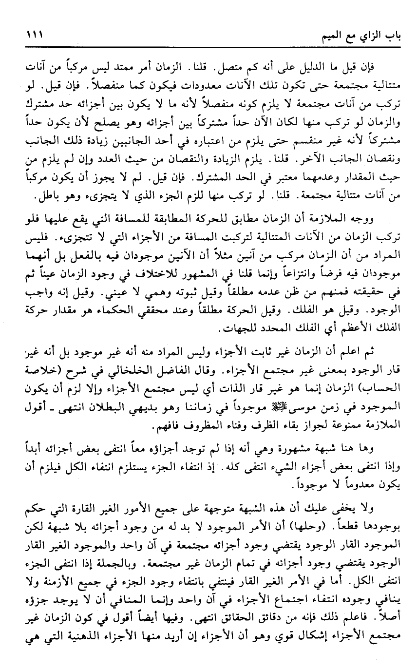 ثمَّ اعْلَم أَن الزَّمَان غير ثَابت الْأَجْزَاء وَلَيْسَ المُرَاد مِنْهُ أَنه غير مَوْجُود بل أَنه غير قار الْوُجُود بِمَعْنى غير مُجْتَمع الْأَجْزَاء. وَقَالَ الْفَاضِل الخلخالي فِي شرح (خُلَاصَة الْحساب) الزَّمَان إِنَّمَا هُوَ غير قار الذَّات أَي لَيْسَ مُجْتَمع الْأَجْزَاء وَإِلَّا لزم أَن يكون الْمَوْجُود فِي زمن مُوسَى عَلَيْهِ السَّلَام مَوْجُودا فِي زَمَاننَا وَهُوَ بديهي الْبطلَان انْتهى - أَقُول الْمُلَازمَة مَمْنُوعَة لجَوَاز بَقَاء الظّرْف وفناء المظروف فَافْهَم.