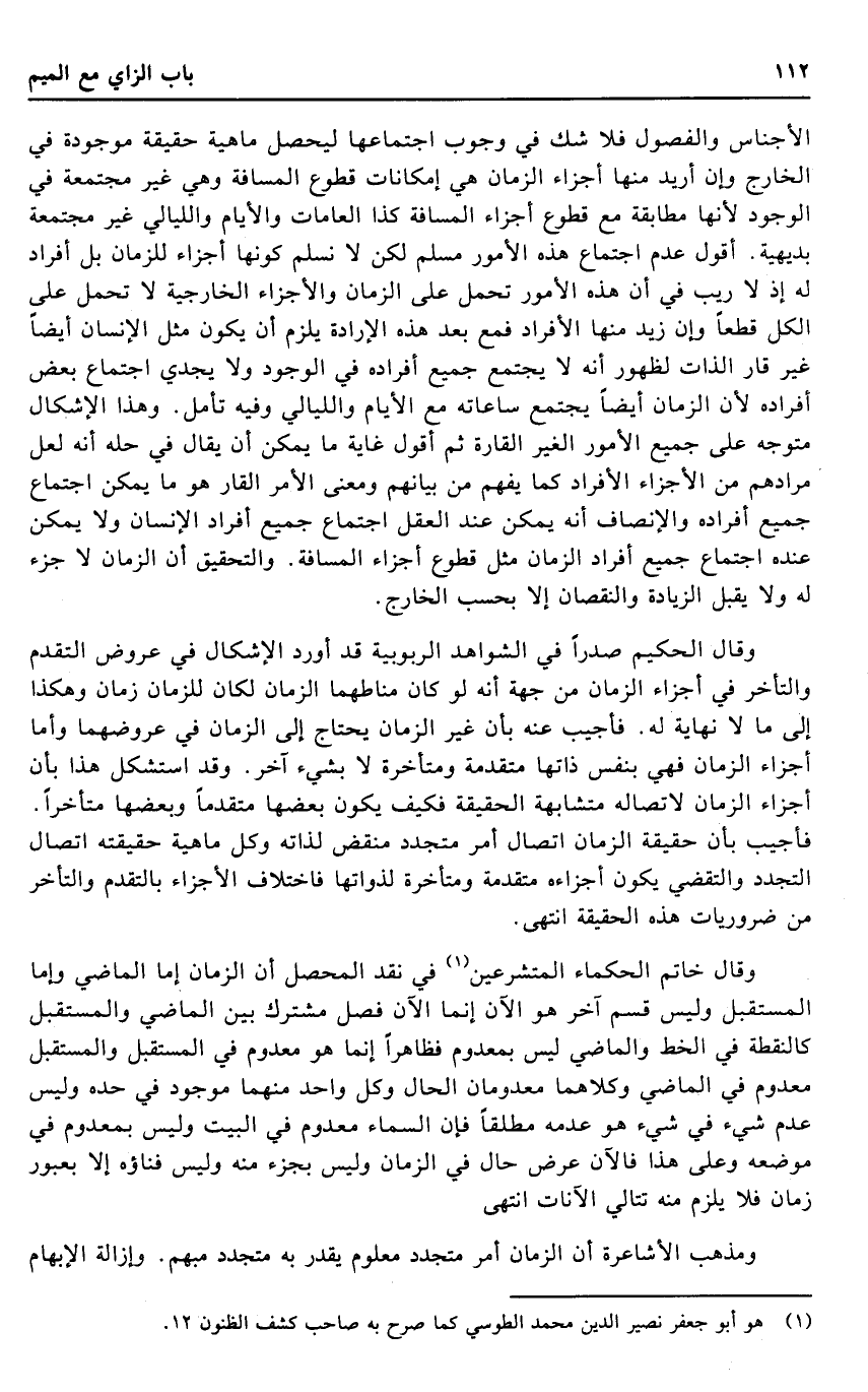 وَقَالَ خَاتم الْحُكَمَاء المتشرعين فِي نقد المحصل أَن الزَّمَان إِمَّا الْمَاضِي وَإِمَّا الْمُسْتَقْبل وَلَيْسَ قسم آخر هُوَ الْآن إِنَّمَا الْآن فصل مُشْتَرك بَين الْمَاضِي والمستقبل كالنقطة فِي الْخط والماضي لَيْسَ بمعدوم فظاهرا إِنَّمَا هُوَ مَعْدُوم فِي الْمُسْتَقْبل والمستقبل مَعْدُوم فِي الْمَاضِي وَكِلَاهُمَا معدومان الْحَال وكل وَاحِد مِنْهُمَا مَوْجُود فِي حَده وَلَيْسَ عدم شَيْء فِي شَيْء هُوَ عَدمه مُطلقًا فَإِن السَّمَاء مَعْدُوم فِي الْبَيْت وَلَيْسَ بمعدوم فِي مَوْضِعه وعَلى هَذَا فَالْآن عرض حَال فِي الزَّمَان وَلَيْسَ بِجُزْء مِنْهُ وَلَيْسَ فناؤه إِلَّا بعبور زمَان فَلَا يلْزم مِنْهُ تتالي الآنات انْتهى