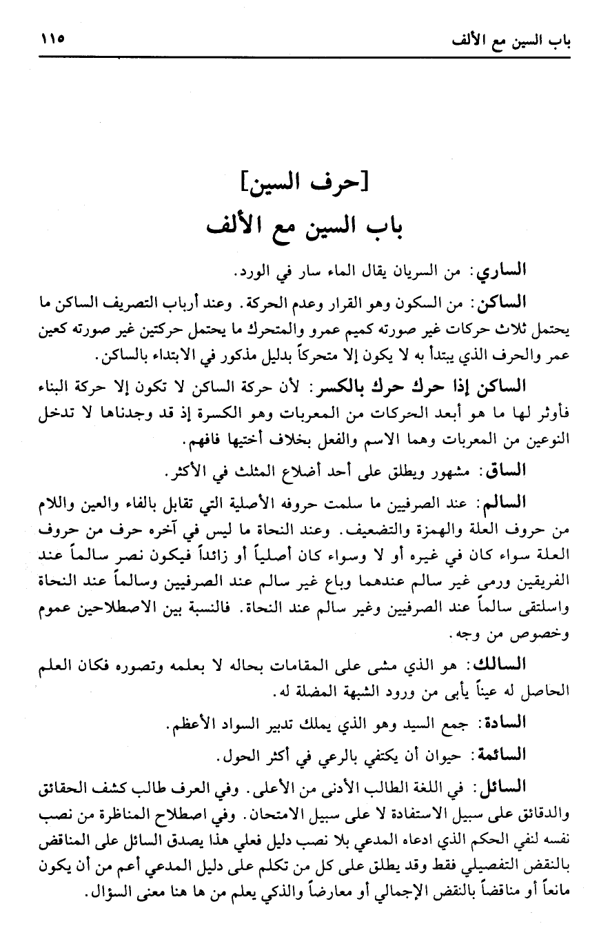 السَّاكِن: من السّكُون وَهُوَ الْقَرار وَعدم الْحَرَكَة. وَعند أَرْبَاب التصريف السَّاكِن مَا يحْتَمل ثَلَاث حركات غير صورته كميم عَمْرو والمتحرك مَا يحْتَمل حركتين غير صورته كعين عمر والحرف الَّذِي يبتدأ بِهِ لَا يكون إِلَّا متحركا بِدَلِيل مَذْكُور فِي الِابْتِدَاء بالساكن.