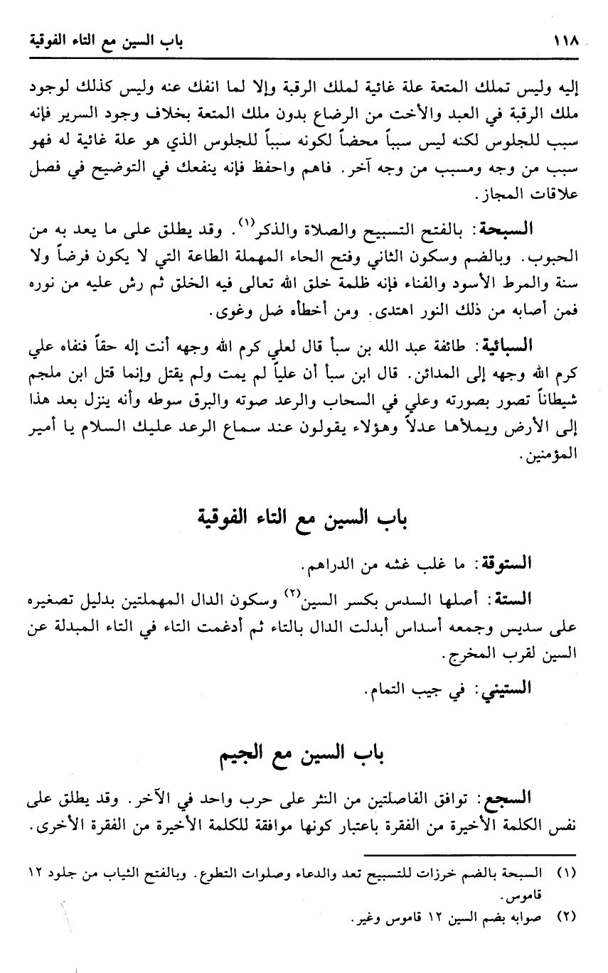 السبحة: بِالْفَتْح التَّسْبِيح وَالصَّلَاة وَالذكر. وَقد يُطلق على مَا يعد بِهِ من الْحُبُوب. وبالضم وَسُكُون الثَّانِي وَفتح الْحَاء الْمُهْملَة الطَّاعَة الَّتِي لَا يكون فرضا وَلَا سنة والمرط الْأسود والفناء فَإِنَّهُ ظلمه خلق الله تَعَالَى فِيهِ الْخلق ثمَّ رش عَلَيْهِ من نوره فَمن أَصَابَهُ من ذَلِك النُّور اهْتَدَى. وَمن أخطأه ضل وغوى.