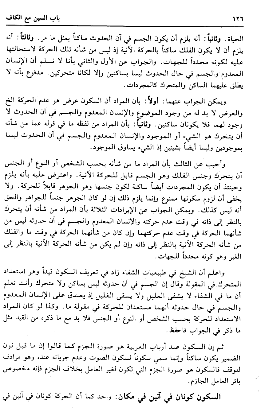وَأجِيب عَن الثَّالِث بِأَن المُرَاد مَا من شَأْنه بِحَسب الشَّخْص أَو النَّوْع أَو الْجِنْس أَن يَتَحَرَّك وجنس الْفلك وَهُوَ الْجِسْم قَابل للحركة الْآنِية. وَاعْترض عَلَيْهِ بِأَنَّهُ يلْزم وَحِينَئِذٍ أَن يكون المجردات أَيْضا سَاكِنة لكَون جِنْسهَا وَهُوَ الْجَوْهَر قَابلا للحركة. وَلَا يخفى أَن لُزُوم سكونها مَمْنُوع وَإِنَّمَا يلْزم ذَلِك إِن لَو كَانَ الْجَوْهَر جِنْسا للجواهر وَالْحق أَنه لَيْسَ كَذَلِك. وَيُمكن الْجَواب عَن الإيرادات الثَّلَاثَة بِأَن المُرَاد من شَأْنه أَن يَتَحَرَّك بِالنّظرِ إِلَى ذَاته فِي وَقت عدم حركته وَالْإِنْسَان الْمَعْدُوم والجسم فِي آخر حُدُوثه لَيْسَ من شَأْنهمَا الْحَرَكَة فِي وَقت عدم حركتهما وَإِن كَانَ من شَأْنهمَا الْحَرَكَة فِي وَقت مَا والفلك من شَأْنه الْحَرَكَة الْآنِية بِالنّظرِ إِلَى ذَاته وَإِن لم يكن من شَأْنه الْحَرَكَة الْآنِية بِالنّظرِ إِلَى الْغَيْر وَهُوَ كَونه محددا للجهات.