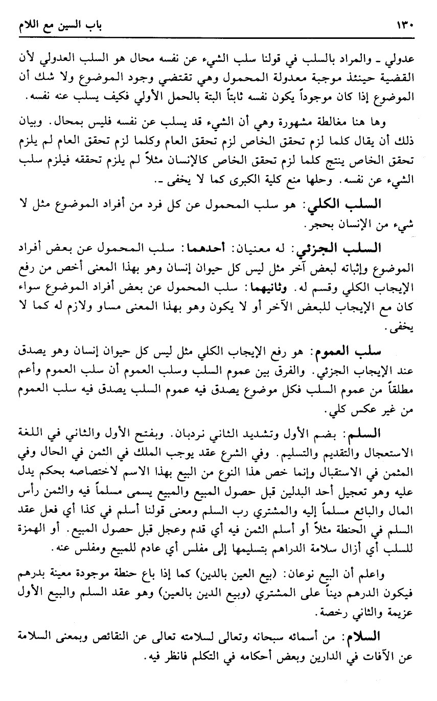 السّلم: بِضَم الأول وَتَشْديد الثَّانِي نردبان. وبفتح الأول وَالثَّانِي فِي اللُّغَة الاستعجال والتقديم وَالتَّسْلِيم. وَفِي الشَّرْع عقد يُوجب الْملك فِي الثّمن فِي الْحَال وَفِي الْمُثمن فِي الِاسْتِقْبَال وَإِنَّمَا خص هَذَا النَّوْع من البيع بِهَذَا الِاسْم لاختصاصه بِحكم يدل عَلَيْهِ وَهُوَ تَعْجِيل أحد الْبَدَلَيْنِ قبل حُصُول الْمَبِيع وَالْمَبِيع يُسمى مُسلما فِيهِ وَالثمن رَأس المَال وَالْبَائِع مُسلما إِلَيْهِ وَالْمُشْتَرِي رب السّلم وَمعنى قَوْلنَا أسلم فِي كَذَا أَي فعل عقد السّلم فِي الْحِنْطَة مثلا أَو أسلم الثّمن فِيهِ أَي قدم وَعجل قبل حُصُول الْمَبِيع. أَو الْهمزَة للسلب أَي أَزَال سَلامَة الدَّرَاهِم بتسليمها إِلَى مُفلس أَي عادم للْمَبِيع ومفلس عَنهُ.