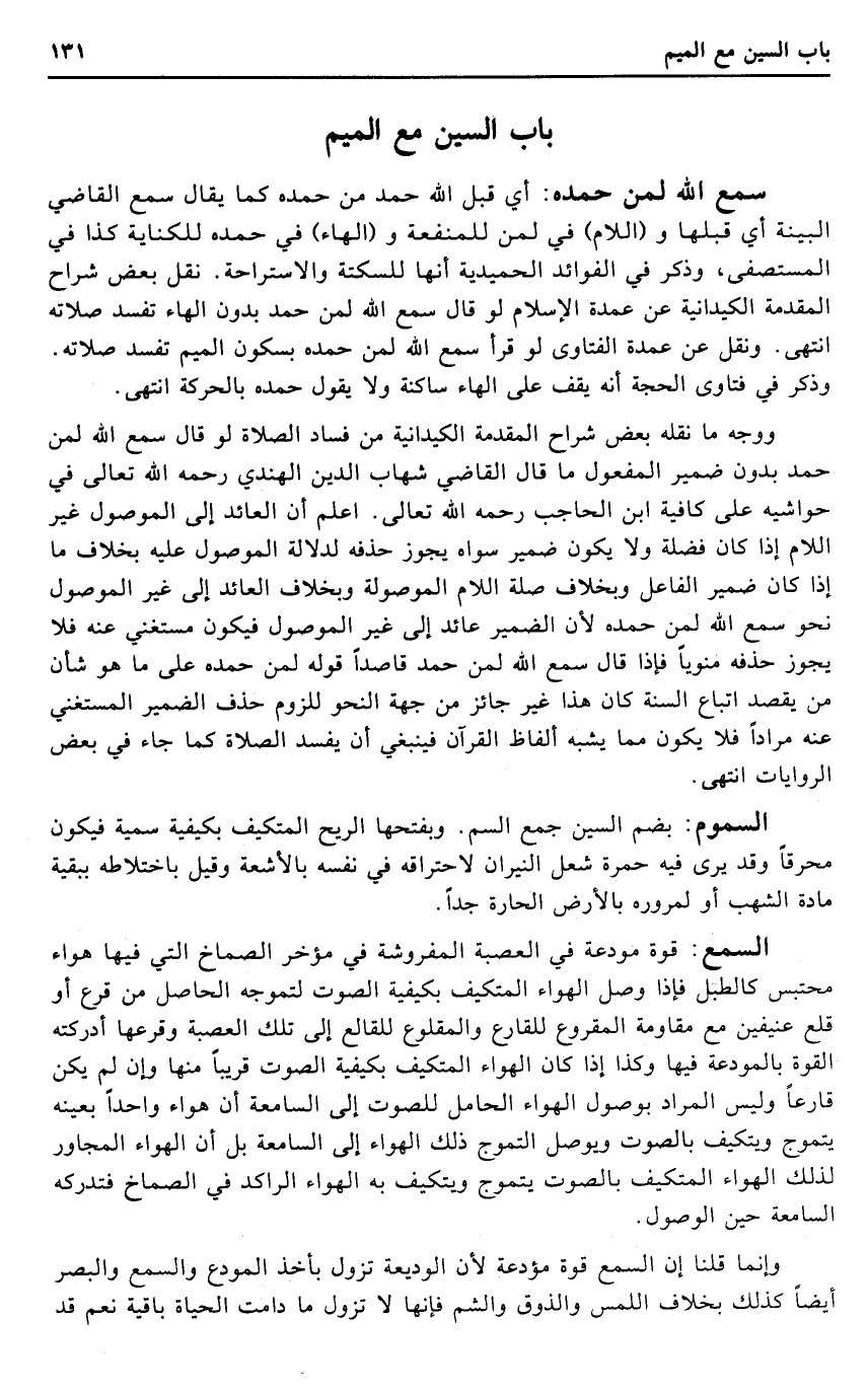 وَوجه مَا نَقله بعض شرَّاح الْمُقدمَة الكيدانية من فَسَاد الصَّلَاة لَو قَالَ سمع الله لمن حمد بِدُونِ ضمير الْمَفْعُول مَا قَالَ القَاضِي شهَاب الدّين الْهِنْدِيّ رَحمَه الله تَعَالَى فِي حَوَاشِيه على كَافِيَة ابْن الْحَاجِب رَحمَه الله تَعَالَى. اعْلَم أَن الْعَائِد إِلَى الْمَوْصُول غير اللَّام إِذا كَانَ فضلَة وَلَا يكون ضمير سواهُ يجوز حذفه لدلَالَة الْمَوْصُول عَلَيْهِ بِخِلَاف مَا إِذا كَانَ ضمير الْفَاعِل وَبِخِلَاف صلَة اللَّام الموصولة وَبِخِلَاف الْعَائِد إِلَى غير الْمَوْصُول نَحْو سمع الله لمن حَمده لِأَن الضَّمِير عَائِد إِلَى غير الْمَوْصُول فَيكون مستغني عَنهُ فَلَا يجوز حذفه منويا فَإِذا قَالَ سمع الله لمن حمد قَاصِدا قَوْله لمن حَمده على مَا هُوَ شَأْن من يقْصد اتِّبَاع السّنة كَانَ هَذَا غير جَائِز من جِهَة النَّحْو للُزُوم حذف الضَّمِير المستغني عَنهُ مرَادا فَلَا يكون مِمَّا يشبه أَلْفَاظ الْقُرْآن فَيَنْبَغِي أَن يفْسد الصَّلَاة كَمَا جَاءَ فِي بعض الرِّوَايَات انْتهى.
