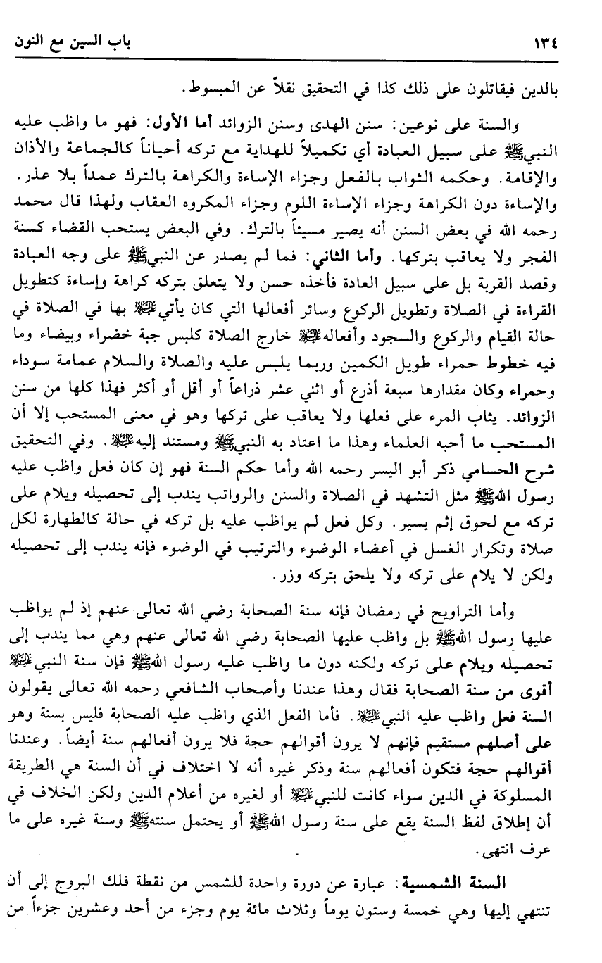 وَالسّنة على نَوْعَيْنِ: سنَن الْهدى وَسنَن الزَّوَائِد أما الأول: فَهُوَ مَا واظب عَلَيْهِ النَّبِي - صَلَّى اللَّهُ عَلَيْهِ وَسَلَّم َ - على سَبِيل الْعِبَادَة أَي تكميلا للهداية مَعَ تَركه أَحْيَانًا كالجماعة وَالْأَذَان وَالْإِقَامَة. وَحكمه الثَّوَاب بِالْفِعْلِ وَجَزَاء الْإِسَاءَة وَالْكَرَاهَة بِالتّرْكِ عمدا بِلَا عذر. والإساءة دون الْكَرَاهَة وَجَزَاء الْإِسَاءَة اللوم وَجَزَاء الْمَكْرُوه الْعقَاب وَلِهَذَا قَالَ مُحَمَّد رَحمَه الله فِي بعض السّنَن أَنه يصير مسيئا بِالتّرْكِ. وَفِي الْبَعْض يسْتَحبّ الْقَضَاء كَسنة الْفجْر وَلَا يُعَاقب بِتَرْكِهَا. وَأما الثَّانِي: فَمَا لم يصدر عَن النَّبِي - صَلَّى اللَّهُ عَلَيْهِ وَسَلَّم َ - على وَجه الْعِبَادَة وَقصد الْقرْبَة بل على سَبِيل الْعَادة فَأَخذه حسن وَلَا يتَعَلَّق بِتَرْكِهِ كَرَاهَة وإساءة كتطويل الْقِرَاءَة فِي الصَّلَاة وَتَطْوِيل الرُّكُوع وَسَائِر أفعالها الَّتِي كَانَ يَأْتِي عَلَيْهِ السَّلَام بهَا فِي الصَّلَاة فِي حَالَة الْقيام وَالرُّكُوع وَالسُّجُود وأفعاله عَلَيْهِ السَّلَام خَارج الصَّلَاة كلبس حَبَّة خضراء وبيضاء وَمَا فِيهِ خطوط حَمْرَاء طَوِيل الكمين وَرُبمَا يلبس عَلَيْهِ الصَّلَاة وَالسَّلَام عِمَامَة سَوْدَاء وحمراء وَكَانَ مقدارها سَبْعَة أَذْرع أَو اثْنَي عشر ذِرَاعا أَو أقل أَو أَكثر فَهَذَا كلهَا من سنَن الزَّوَائِد. يُثَاب الْمَرْء على فعلهَا وَلَا يُعَاقب على تَركهَا وَهُوَ فِي معنى الْمُسْتَحبّ إِلَّا أَن الْمُسْتَحبّ مَا أحبه الْعلمَاء وَهَذَا مَا اعْتَادَ بِهِ النَّبِي - صَلَّى اللَّهُ عَلَيْهِ وَسَلَّم َ - ومستند إِلَيْهِ عَلَيْهِ السَّلَام. وَفِي التَّحْقِيق شرح الحسامي ذكر أَبُو الْيُسْر رَحمَه الله وَأما حكم السّنة فَهُوَ إِن كَانَ فعل واظب عَلَيْهِ رَسُول الله - صَلَّى اللَّهُ عَلَيْهِ وَسَلَّم َ - مثل التَّشَهُّد فِي الصَّلَاة وَالسّنَن والرواتب ينْدب إِلَى تَحْصِيله ويلام على تَركه مَعَ لُحُوق إِثْم يسير. وكل فعل لم يواظب عَلَيْهِ بل تَركه فِي حَالَة كالطهارة لكل صَلَاة وتكرار الْغسْل فِي أَعْضَاء الْوضُوء وَالتَّرْتِيب فِي الْوضُوء فَإِنَّهُ ينْدب إِلَى تَحْصِيله وَلَكِن لَا يلام على تَركه وَلَا يلْحق بِتَرْكِهِ وزر.
