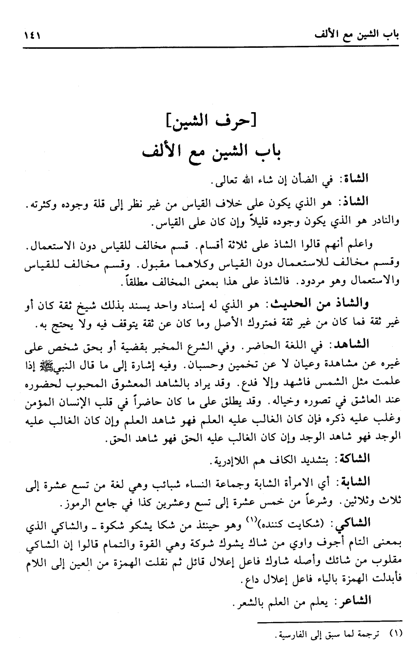 والشاذ من الحَدِيث: هُوَ الَّذِي لَهُ إِسْنَاد وَاحِد يسند بذلك شيخ ثِقَة كَانَ أَو غير ثِقَة فَمَا كَانَ من غير ثِقَة فمتروك الأَصْل وَمَا كَانَ عَن ثِقَة يتَوَقَّف فِيهِ وَلَا يحْتَج بِهِ.