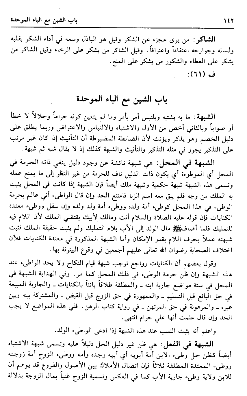 الشُّبْهَة فِي الْفِعْل: هِيَ ظن غير دَلِيل الْحل دَلِيلا عَلَيْهِ وَتسَمى شُبْهَة الِاشْتِبَاه أَيْضا كظن حل وطئ الابْن أمة أَبَوَيْهِ أَي أَبِيه وجده وَأمه ووطئ الزَّوْج أمة زَوجته ووطئ الْمُعْتَدَّة الْمُطلقَة ثَلَاثًا فَإِن اتِّصَال الْأَمْلَاك بَين الْأُصُول وَالْفُرُوع قد يُوهم أَن للِابْن ولَايَة وطئ جَارِيَة الْأَب كَمَا فِي الْعَكْس وَتَسْمِيَة الزَّوْج غَنِيا بِمَال الزَّوْجَة بِدلَالَة