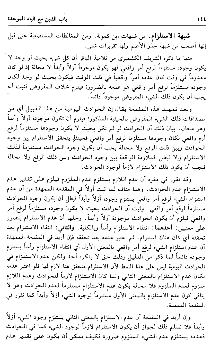 وَقد تقرر فِي مقره أَن عدم اللَّازِم يسْتَلْزم عدم الْمَلْزُوم فَيلْزم على تَقْدِير عدم الاستلزام عدم الْحَوَادِث. وَهَذَا منَاف لما ثَبت أَولا فِي الْمُقدمَة الممهدة من أَن عدم استلزام الشَّيْء لرفع أَمر واقعي يسْتَلْزم وُجُوه أزلا وأبدا فَبَطل أَن يكون وجود الْحَوَادِث مستلزما لرفع أَمر واقعي. وَثَبت أَن الْحَوَادِث بِحَيْثُ لَا يكون وجوده مستلزما لرفع أَمر واقعي فَيلْزم أَن يكون الْحَوَادِث مَوْجُودَة أزلا وأبدا. وحلها أَن عدم الاستلزام يتَصَوَّر على مَعْنيين: أَحدهمَا: انْتِفَاء الاستلزام رَأْسا وبالكلية. وَالثَّانِي: انْتِفَاء الاستلزام بعد تحَققه أَي كَانَ هُنَاكَ استلزام. ثمَّ اعْتبر عَدمه بعد تحَققه فَإِن أُرِيد فِي الْمُقدمَة الممهدة أَن عدم استلزام الشَّيْء لرفع أَمر واقعي بِالْمَعْنَى الأول أَي انْتِفَاء الاستلزام رَأْسا يسْتَلْزم وجوده دَائِما لما ذكر من الدَّلِيل وَذَلِكَ حق لَا يُنكره أحد وَلَكِن عدم الاستلزام فِي الْحَوَادِث اليومية لَيْسَ على هَذَا النمط لِأَن الاستلزام مُتَحَقق هُنَا لَازم لَهَا فَلَو اعْتبر عَدمه لَكَانَ عدم الاستلزام بِالْمَعْنَى الثَّانِي وَلما كَانَ الاستلزام لَازِما للحوادث وَعدم اللَّازِم ملزوم لعدم الْمَلْزُوم فَلَا محَالة يكون عدم الاستلزام مستلزما لعدم الْحَوَادِث وَهُوَ لَا يُنَافِي كَون عدم الاستلزام بِالْمَعْنَى الأول مستلزما لوُجُود الشَّيْء أزلا وأبدا كَمَا تقرر فِي الْمُقدمَة الممهدة.