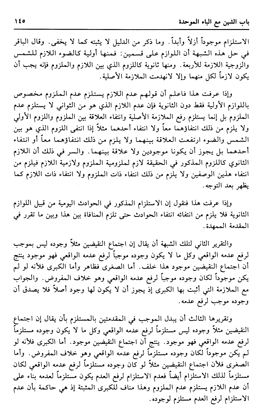 الاستلزام مَوْجُودا أزلا وأبدا. وَمَا ذكر من الدَّلِيل لَا يُثبتهُ كَمَا لَا يخفى. وَقَالَ الباقر فِي حل هَذِه الشُّبْهَة أَن اللوازم على قسمَيْنِ: فَمِنْهَا أولية كالضوء اللَّازِم للشمس والزوجية اللَّازِمَة للأربعة. وَمِنْهَا ثانوية كاللزوم الَّذِي بَين اللَّازِم والملزوم فَإِنَّهُ يجب أَن يكون لَازِما لكل مِنْهُمَا وَإِلَّا لانهدمت الْمُلَازمَة الْأَصْلِيَّة.