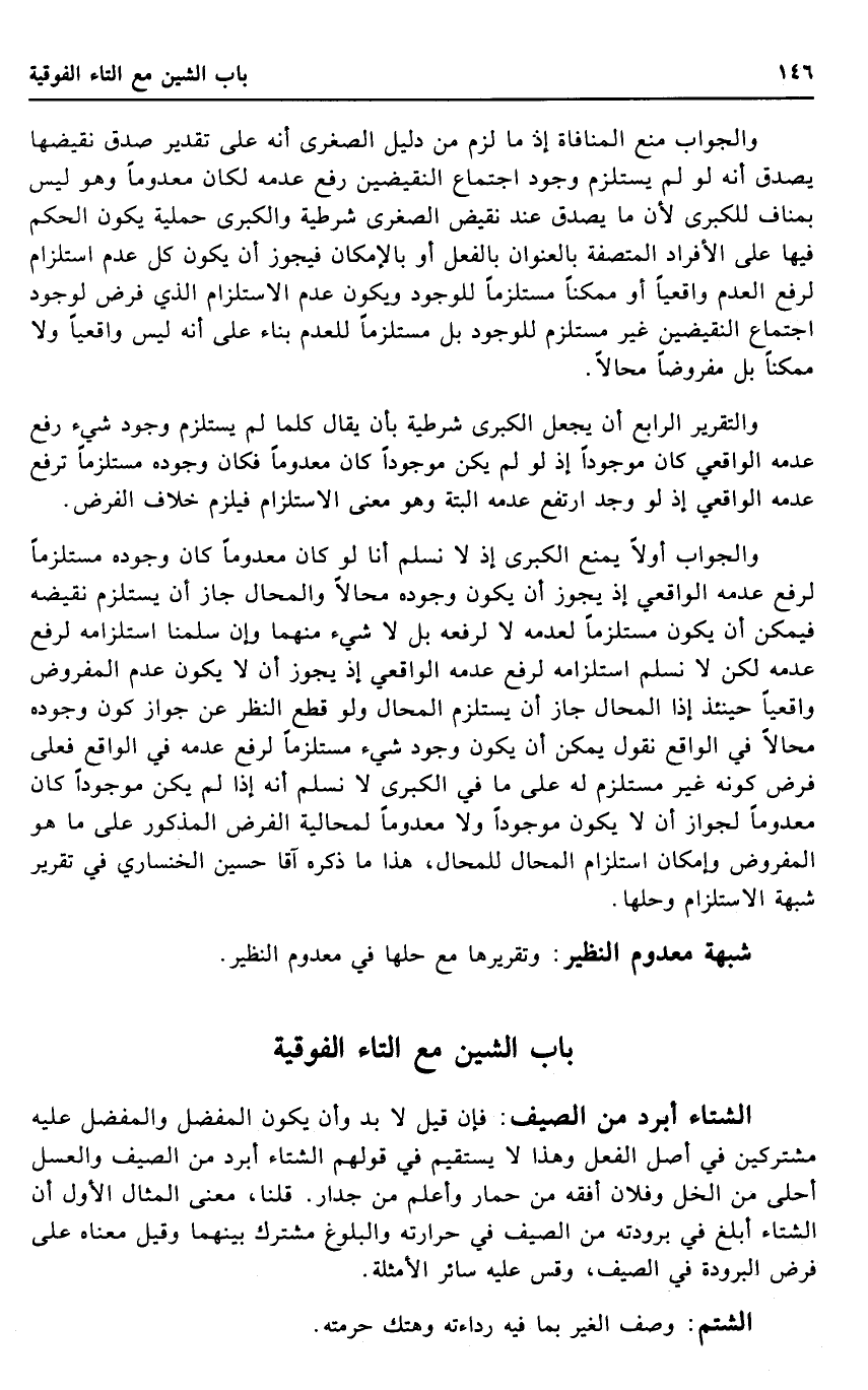 وَالْجَوَاب أَولا يمْنَع الْكُبْرَى إِذْ لَا نسلم أَنا لَو كَانَ مَعْدُوما كَانَ وجوده مستلزما لرفع عَدمه الواقعي إِذْ يجوز أَن يكون وجود محالا والمحال جَازَ أَن يسْتَلْزم نقيضه فَيمكن أَن يكون مستلزما لعدمه لَا لرفعه بل لَا شَيْء مِنْهُمَا وَإِن سلمنَا استلزامه لرفع عَدمه لَكِن لَا نسلم استلزامه لرفع عَدمه الواقعي إِذْ يجوز أَن لَا يكون عدم الْمَفْرُوض واقعيا حِينَئِذٍ إِذا الْمحَال جَازَ أَن يسْتَلْزم الْمحَال وَلَو قطع النّظر عَن جَوَاز كَون وجوده محالا فِي الْوَاقِع نقُول يُمكن أَن يكون وجود شَيْء مستلزما لرفع عَدمه فِي الْوَاقِع فعلى فرض كَونه غير مُسْتَلْزم لَهُ على مَا فِي الْكُبْرَى لَا نسلم أَنه إِذا لم يكن مَوْجُودا كَانَ مَعْدُوما لجَوَاز أَن لَا يكون مَوْجُودا وَلَا مَعْدُوما لمحالية الْفَرْض الْمَذْكُور على مَا هُوَ الْمَفْرُوض وَإِمْكَان استلزام الْمحَال للمحال هَذَا مَا ذكره آقا حُسَيْن الخنساري فِي تَقْرِير شُبْهَة الاستلزام وحلها.