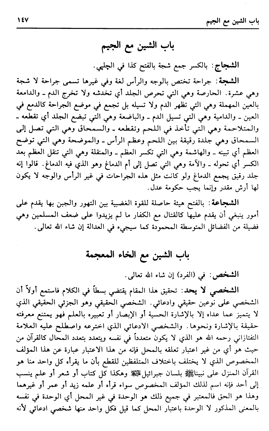 الشخصي لَا يحد: تَحْقِيق هَذَا الْمقَام يَقْتَضِي بسطا فِي الْكَلَام فاستمع أَولا أَن الشخصي على نَوْعَيْنِ حَقِيقِيّ وادعائي. الشخصي الْحَقِيقِيّ وَهُوَ الجزئي الْحَقِيقِيّ الَّذِي لَا يتَمَيَّز عَمَّا عداهُ إِلَّا بِالْإِشَارَةِ الحسية أَو الإبصار أَو تَعْبِيره بِالْعلمِ فَهُوَ يمْتَنع مَعْرفَته حَقِيقَة بِالْإِشَارَةِ وَنَحْوهَا. والشخصي الادعائي الَّذِي اخترعه واصطلح عَلَيْهِ الْعَلامَة التَّفْتَازَانِيّ رَحمَه الله هُوَ الَّذِي لَا يكون مُتَعَددًا فِي نَفسه ويتعدد بِتَعَدُّد الْمحَال كالقرآن من حَيْثُ هُوَ أَي من غير اعْتِبَار تعلقه بِالْمحل فَإِنَّهُ من هَذَا الِاعْتِبَار عبارَة عَن هَذَا الْمُؤلف الْمَخْصُوص الَّذِي لَا يخْتَلف باخْتلَاف المتلفظين للْقطع بِأَن مَا يقرأه كل وَاحِد منا هُوَ الْقُرْآن الْمنزل على نَبينَا - صَلَّى اللَّهُ عَلَيْهِ وَسَلَّم َ - بِلِسَان جِبْرَائِيل عَلَيْهِ السَّلَام وَهَكَذَا كل كتاب أَو شعر أَو علم ينْسب إِلَى أحد فَإِنَّهُ اسْم لذَلِك الْمُؤلف الْمَخْصُوص سَوَاء قَرَأَهُ أَو علمه زيد أَو عمر أَو غَيرهمَا وَهَذَا هُوَ الْحق فَالْمُعْتَبر فِي جَمِيع ذَلِك هُوَ الْوحدَة فِي غير الْمحل أَي الْوحدَة فِي نَفسه بِالْمَعْنَى الْمَذْكُور لَا الْوحدَة بِاعْتِبَار الْمحل كَمَا قيل فَكل وَاحِد مِنْهَا شخصي ادعائي لِأَنَّهُ