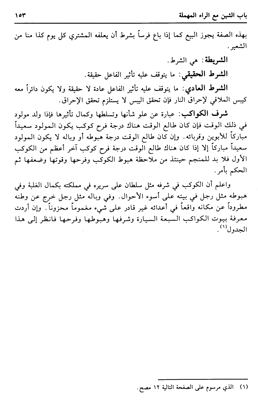 الشَّرْط العادي: مَا يتَوَقَّف عَلَيْهِ تَأْثِير الْفَاعِل عَادَة لَا حَقِيقَة وَلَا يكون دائرا مَعَه كيبس الملاقي لإحراق النَّار فَإِن تحقق اليبس لَا يسْتَلْزم تحقق الإحراق.