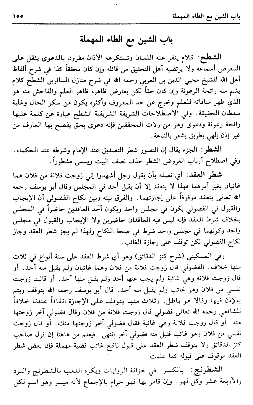 شطر العقد: أَي نصفه بِأَن يَقُول رجل أشهدوا إِنِّي زوجت فُلَانَة من فلَان هما غائبان بِغَيْر أَمرهمَا فَهَذَا لَا ينْعَقد إِلَّا أَن يقبل أحد فِي الْمجْلس وَقَالَ أَبُو يُوسُف رَحمَه الله تَعَالَى ينْعَقد مَوْقُوفا على إجازتهما. وَالْفرق بَينه وَبَين نِكَاح الْفُضُولِيّ أَن الْإِيجَاب وَالْقَبُول فِي الْفُضُولِيّ يكون فِي مجْلِس وَاحِد وَيكون أحد الْعَاقِدين حَاضرا فِي الْمجْلس بِخِلَاف شَرط العقد فَإِنَّهُ لَيْسَ فِيهِ العاقدان حاضرين وَلَا الْإِيجَاب وَالْقَبُول فِي مجْلِس وَاحِد وكونهما فِي مجْلِس وَاحِد شَرط فِي صِحَة النِّكَاح وَلِهَذَا لم يجز شطر العقد وَجَاز نِكَاح الْفُضُولِيّ لَكِن توقف على إجَازَة الْغَائِب.