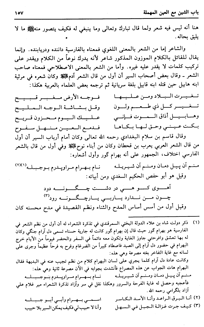 وَقَالَ قَاسم بن سَلام الْبَغْدَادِيّ رَحمَه الله تَعَالَى وَكَانَ أَمَام أَرْبَاب السّير أَن أول من قَالَ الشّعْر الْعَرَبِيّ يعرب بن قحطان وَكَانَ من أَبنَاء نوح عَلَيْهِ السَّلَام وَفِي أول من قَالَ بالشعر الْفَارِسِي اخْتِلَاف، الْجُمْهُور على أَنه بهْرَام كور وَأول أشعاره: