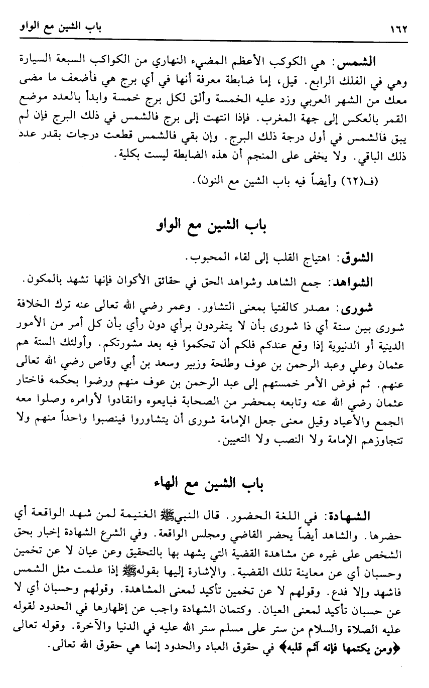 الشَّهَادَة: فِي اللُّغَة الْحُضُور. قَالَ النَّبِي - صَلَّى اللَّهُ عَلَيْهِ وَسَلَّم َ - الْغَنِيمَة لمن شهد الْوَاقِعَة أَي حضرها. وَالشَّاهِد أَيْضا يحضر القَاضِي ومجلس الْوَاقِعَة. وَفِي الشَّرْع الشَّهَادَة إِخْبَار بِحَق الشَّخْص على غَيره عَن مُشَاهدَة الْقَضِيَّة الَّتِي يشْهد بهَا بالتحقيق وَعَن عيان لَا عَن تخمين وحسبان أَي عَن مُعَاينَة تِلْكَ الْقَضِيَّة. وَالْإِشَارَة إِلَيْهَا بقوله - صَلَّى اللَّهُ عَلَيْهِ وَسَلَّم َ - إِذا علمت مثل الشَّمْس فاشهد وَإِلَّا فدع. وَقَوْلهمْ لَا عَن تخمين تَأْكِيد لِمَعْنى الْمُشَاهدَة. وَقَوْلهمْ وحسبان أَي لَا عَن حسبان تَأْكِيد لِمَعْنى العيان. وكتمان الشَّهَادَة وَاجِب عَن إظهارها فِي الْحُدُود لقَوْله عَلَيْهِ الصَّلَاة وَالسَّلَام من ستر على مُسلم ستر الله عَلَيْهِ فِي الدُّنْيَا وَالْآخِرَة. وَقَوله تَعَالَى {وَمن يكتمها فَإِنَّهُ آثم قلبه} فِي حُقُوق الْعباد وَالْحُدُود إِنَّمَا هِيَ حُقُوق الله تَعَالَى.
