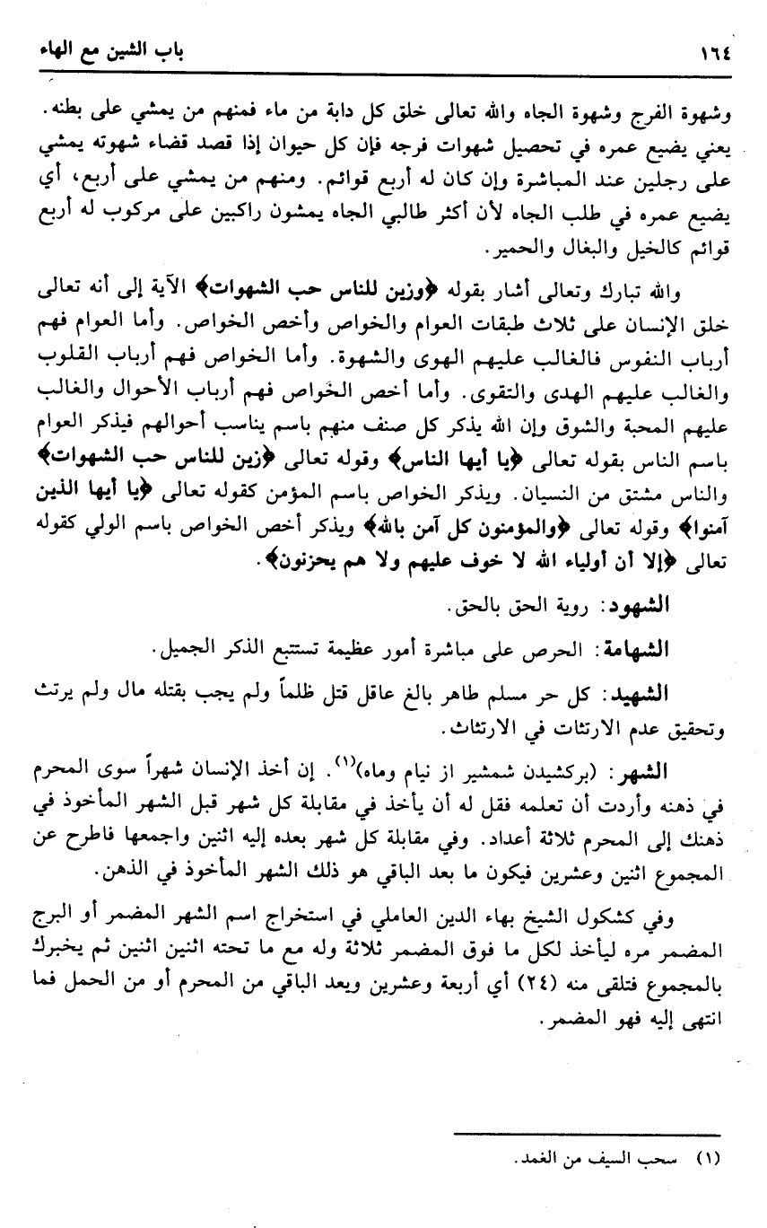 وَالله تبَارك وَتَعَالَى أَشَارَ بقوله {وزين للنَّاس حب الشَّهَوَات} الْآيَة إِلَى أَنه تَعَالَى خلق الْإِنْسَان على ثَلَاث طَبَقَات الْعَوام والخواص وأخص الْخَواص. وَأما الْعَوام فهم أَرْبَاب النُّفُوس فالغالب عَلَيْهِم الْهوى والشهوة. وَأما الْخَواص فهم أَرْبَاب الْقُلُوب وَالْغَالِب عَلَيْهِم الْهدى وَالتَّقوى. وَأما أخص الْخَواص فهم أَرْبَاب الْأَحْوَال وَالْغَالِب عَلَيْهِم الْمحبَّة والشوق وَإِن الله يذكر كل صنف مِنْهُم باسم يُنَاسب أَحْوَالهم فيذكر الْعَوام باسم النَّاس بقوله تَعَالَى {يَا أَيهَا النَّاس} وَقَوله تَعَالَى {زين للنَّاس حب الشَّهَوَات} وَالنَّاس مُشْتَقّ من النسْيَان. وَيذكر الْخَواص باسم الْمُؤمن كَقَوْلِه تَعَالَى {يَا أَيهَا الَّذين آمنُوا} وَقَوله تَعَالَى {والمؤمنون كل آمن بِاللَّه} وَيذكر أخص الْخَواص باسم الْوَلِيّ كَقَوْلِه تَعَالَى {إِلَّا أَن أَوْلِيَاء الله لَا خوف عَلَيْهِم وَلَا هم يَحْزَنُونَ} .