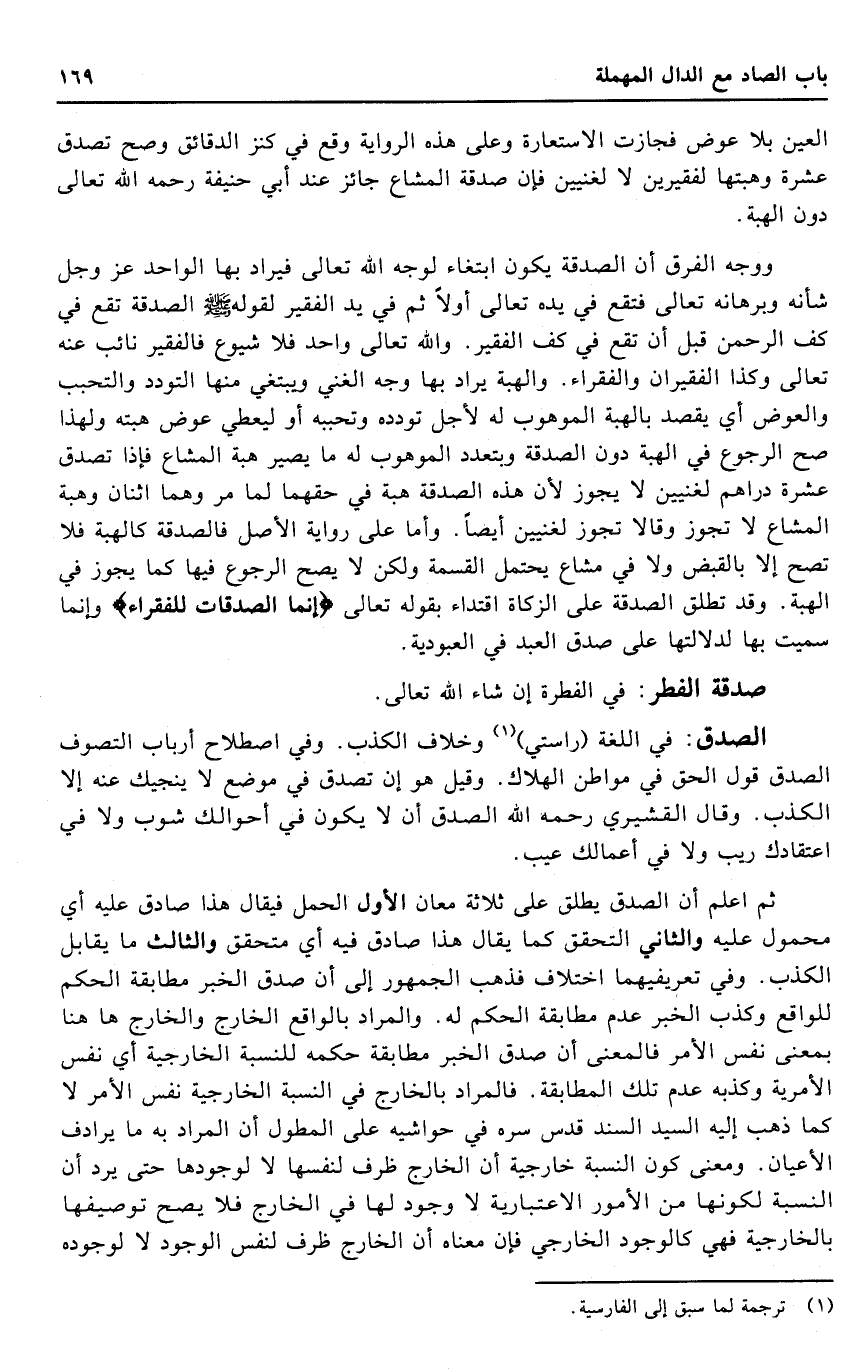 ثمَّ اعْلَم أَن الصدْق يُطلق على ثَلَاثَة معَان الأول الْحمل فَيُقَال هَذَا صَادِق عَلَيْهِ أَي مَحْمُول عَلَيْهِ وَالثَّانِي التحقق كَمَا يُقَال هَذَا صَادِق فِيهِ أَي مُتَحَقق وَالثَّالِث مَا يُقَابل الْكَذِب. وَفِي تعريفيهما اخْتِلَاف فَذهب الْجُمْهُور إِلَى أَن صدق الْخَبَر مُطَابقَة الحكم للْوَاقِع وَكذب الْخَبَر عدم مُطَابقَة الحكم لَهُ. وَالْمرَاد بالواقع الْخَارِج وَالْخَارِج هَا هُنَا بِمَعْنى نفس الْأَمر فَالْمَعْنى أَن صدق الْخَبَر مُطَابقَة حكمه للنسبة الخارجية أَي نفس الأمرية وَكذبه عدم تِلْكَ الْمُطَابقَة. فَالْمُرَاد بالخارج فِي النِّسْبَة الخارجية نفس الْأَمر لَا كَمَا ذهب إِلَيْهِ السَّيِّد السَّنَد قدس سره فِي حَوَاشِيه على المطول أَن المُرَاد بِهِ مَا يرادف الْأَعْيَان. وَمعنى كَون النِّسْبَة خارجية أَن الْخَارِج ظرف لنَفسهَا لَا لوجودها حَتَّى يرد أَن النِّسْبَة لكَونهَا من الْأُمُور الاعتبارية لَا وجود لَهَا فِي الْخَارِج فَلَا يَصح توصيفها بالخارجية فَهِيَ كالوجود الْخَارِجِي فَإِن مَعْنَاهُ أَن الْخَارِج ظرف لنَفس الْوُجُود لَا لوُجُوده