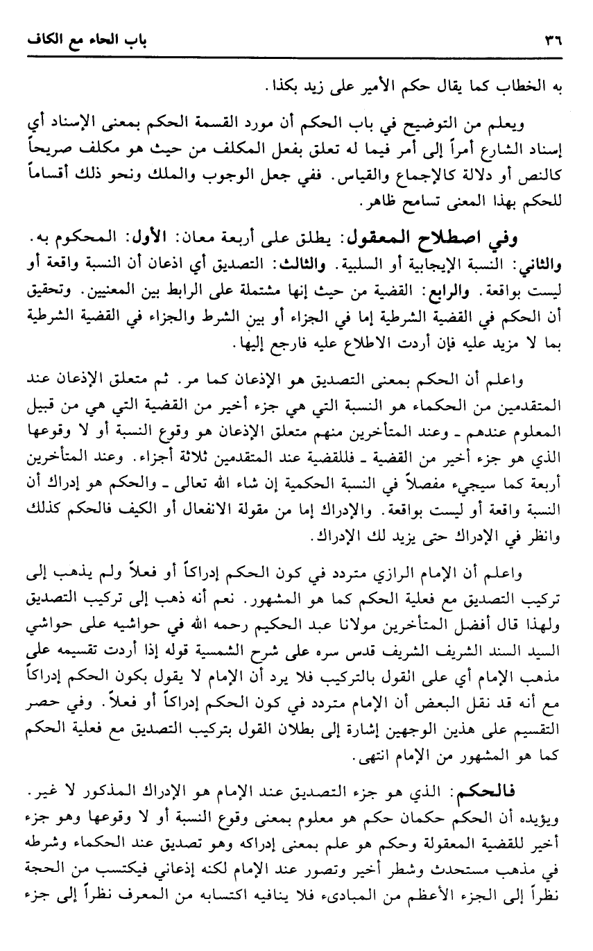 وَاعْلَم أَن الإِمَام الرَّازِيّ مُتَرَدّد فِي كَون الحكم إدراكا أَو فعلا وَلم يذهب إِلَى تركيب التَّصْدِيق مَعَ فعلية الحكم كَمَا هُوَ الْمَشْهُور. نعم أَنه ذهب إِلَى تركيب التَّصْدِيق وَلِهَذَا قَالَ أفضل الْمُتَأَخِّرين مَوْلَانَا عبد الْحَكِيم رَحمَه الله فِي حَوَاشِيه على حَوَاشِي السَّيِّد السَّنَد الشريف الشريف قدس سره على شرح الشمسية قَوْله إِذا أردْت تقسيمه على مَذْهَب الإِمَام أَي على القَوْل بالتركيب فَلَا يرد أَن الإِمَام لَا يَقُول بِكَوْن الحكم إدراكا مَعَ أَنه قد نقل الْبَعْض أَن الإِمَام مُتَرَدّد فِي كَون الحكم إدراكا أَو فعلا. وَفِي حصر التَّقْسِيم على هذَيْن الْوَجْهَيْنِ إِشَارَة إِلَى بطلَان القَوْل بتركيب التَّصْدِيق مَعَ فعلية الحكم كَمَا هُوَ الْمَشْهُور من الإِمَام انْتهى.