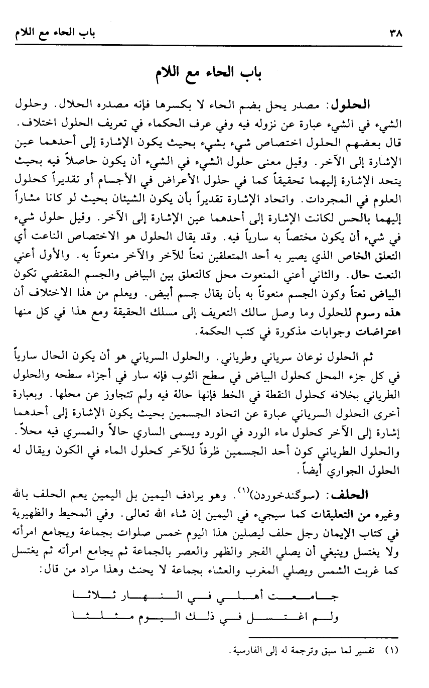 الْحُلُول: مصدر يحل بِضَم الْحَاء لَا بِكَسْرِهَا فَإِنَّهُ مصدره الْحَلَال. وحلول الشَّيْء فِي الشَّيْء عبارَة عَن نُزُوله فِيهِ وَفِي عرف الْحُكَمَاء فِي تَعْرِيف الْحُلُول اخْتِلَاف. قَالَ بَعضهم الْحُلُول اخْتِصَاص شَيْء بِشَيْء بِحَيْثُ يكون الْإِشَارَة إِلَى أَحدهمَا عين الْإِشَارَة إِلَى الآخر. وَقيل معنى حُلُول الشَّيْء فِي الشَّيْء أَن يكون حَاصِلا فِيهِ بِحَيْثُ يتحد الْإِشَارَة إِلَيْهِمَا تَحْقِيقا كَمَا فِي حُلُول الْأَعْرَاض فِي الْأَجْسَام أَو تَقْديرا كحلول الْعُلُوم فِي المجردات. واتحاد الْإِشَارَة تَقْديرا بِأَن يكون الشيئان بِحَيْثُ لَو كَانَا مشارا إِلَيْهِمَا بالحس لكَانَتْ الْإِشَارَة إِلَى أَحدهمَا عين الْإِشَارَة إِلَى الآخر. وَقيل حُلُول شَيْء فِي شَيْء أَن يكون مُخْتَصًّا بِهِ ساريا فِيهِ. وَقد يُقَال الْحُلُول هُوَ الِاخْتِصَاص الناعت أَي التَّعَلُّق الْخَاص الَّذِي يصير بِهِ أحد المتعلقين نعتا للْآخر وَالْآخر منعوتا بِهِ. وَالْأول أَعنِي النَّعْت حَال. وَالثَّانِي أَعنِي المنعوت مَحل كالتعلق بَين الْبيَاض والجسم الْمُقْتَضِي تكون الْبيَاض نعتا وَكَون الْجِسْم منعوتا بِهِ بِأَن يُقَال جسم أَبيض. وَيعلم من هَذَا الِاخْتِلَاف أَن هَذِه رسوم للحلول وَمَا وصل سالك التَّعْرِيف إِلَى مَسْلَك الْحَقِيقَة وَمَعَ هَذَا فِي كل مِنْهَا اعتراضات وجوابات مَذْكُورَة فِي كتب الْحِكْمَة.