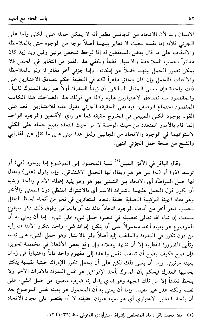 وَقَالَ الباقر فِي الْأُفق الْمُبين نِسْبَة الْمَحْمُول إِلَى الْمَوْضُوع إِمَّا بِوُجُود (فِي) أَو توَسط (ذُو) أَو (لَهُ) بَين هُوَ هُوَ وَيُقَال لَهَا الْحمل الاشتقاقي. وَإِمَّا بقول (على) وَيُقَال لَهَا حمل المواطأة أَي الِاتِّحَاد بَين الشَّيْئَيْنِ بهو هُوَ وَهُوَ يُفِيد إِعْطَاء الِاسْم وَالْحَد وَيُشبه أَن يكون قَول الْحمل عَلَيْهِمَا باشتراك الِاسْم أَي بالاشتراك اللَّفْظِيّ دون الْمَعْنى وَالْآخر وَهُوَ مفَاد الْهَيْئَة التركيبية الحملية حَقِيقَة اتِّحَاد المتغائرين فِي نَحْو من أنحاء لحاظ التعقل بِحَسب نَحْو آخر من أنحاء الْوُجُود اتحادا بِالذَّاتِ أَو بِالْعرضِ وَفَوق ذَلِك ذكر سيقرع سَمعك إِن شَاءَ الله تَعَالَى تَفْصِيله فِي تبصرة حمل شَيْء على شَيْء. إِمَّا أَن يَعْنِي بِهِ أَن الْمَوْضُوع هُوَ بِعَيْنِه أَخذ مَحْمُولا على أَن يتَكَرَّر إِدْرَاك شَيْء وَاحِد بِتَكَرُّر الِالْتِفَات إِلَيْهِ من دون تكَرر فِي الْمدْرك والملتفت إِلَيْهِ أصلا وَلَو بِالِاعْتِبَارِ وَهُوَ حمل الشَّيْء على نَفسه وتأبى الضَّرُورَة الفطرية إِلَّا أَن تشهد بِبُطْلَانِهِ وَإِن وَقع بعض الأذهان فِي مَخْمَصَة تجويزه فَإِن صَحَّ فَكيف يَصح أَن تلْتَفت نفس وَاحِدَة إِلَى مَفْهُوم وَاحِد ذاتا واعتبارا فِي زمَان بِعَيْنِه مرَّتَيْنِ. وَإِمَّا أَن يَعْنِي ذَلِك لَكِن على أَن يَجْعَل تكَرر الْإِدْرَاك حيثية تقيدية يتكثر بحسبها الْمدْرك فَيحكم بِأَن الْمدْرك بِأحد الإدراكين هُوَ نفس الْمدْرك بالإدراك الآخر وَلَا يلحظ تعددا إِلَّا من تِلْكَ الْجِهَة وَهُوَ الَّذِي يُقَال إِنَّه ضرب مَنْصُور من حمل الشَّيْء على نَفسه وَلكنه هدر غير مُفِيد. وَإِمَّا أَن يَعْنِي بِهِ أَن الْمَحْمُول هُوَ بِعَيْنِه نفس الْمَوْضُوع بعد أَن يلحظ التغاير الاعتباري أَي هُوَ بِعَيْنِه عنوان حَقِيقَته لَا أَن يقْتَصر على مُجَرّد الِاتِّحَاد
